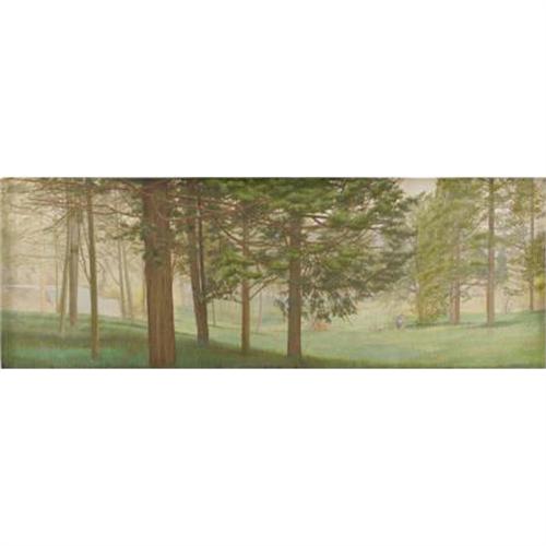 <B>RICHARD CHIRIANI (American, b. 1942)</B></I><BR><I>Afternoon in the Forest</B></I><BR>Tempera on paper laid on cardboard<BR>7-1/4 x 20-1/2 inches (18.4 x 52.1 cm)<BR>Signed lower right: <I>Chiriani</B></I><BR> <BR>PROVENANCE:<BR>Chandler Estate<B>Condition Report:</B> Minor water spots to lower left, small area of white residue to center.<BR><BR><b>Shipping:</b> Framed - without Glass, Small (<a target="_blank" href="http://www.heritageauctions.com/common/shipping.php">view shipping information</a>)