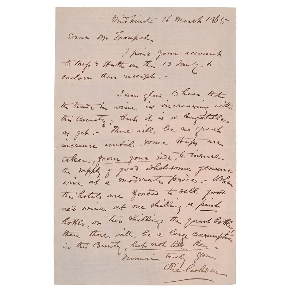 ALS signed “Ric. Cobden,†one page, 5.5 x 8.25, March 16, 1865. Handwritten letter to "Mr. Troupel," in part: "I am glad to hear that the trade in wine is increasing with this Country, but it is a bagatelle as yet. There will be no great increase until some steps are taken, from your side, to insure the supply of good wholesome genuine wine at a moderate price. When the hotels are forced to sell good red wine at one shilling a pint bottle, or two shillings the quart bottle, then there will be a large consumption in this country, but not till then." In fine condition.