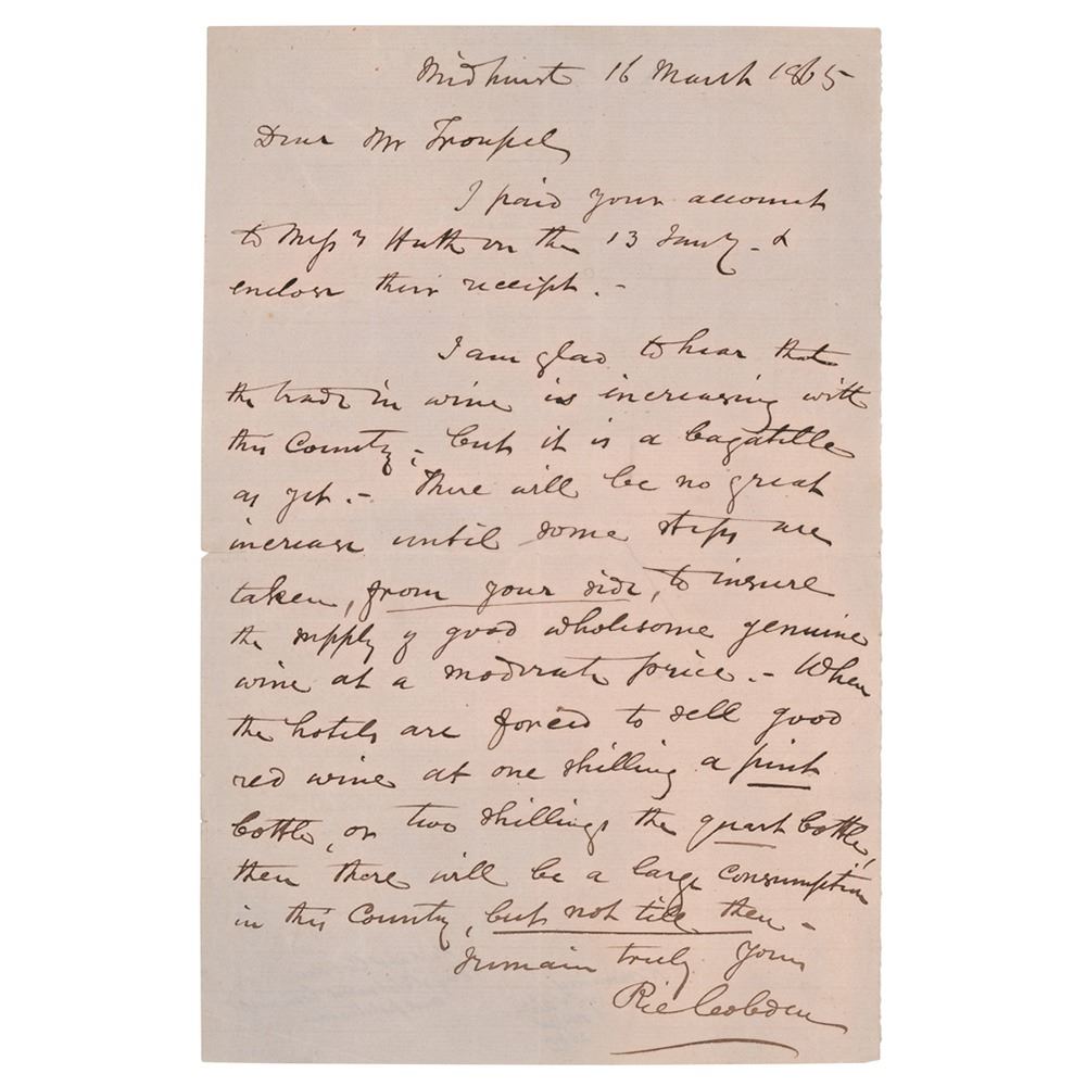 ALS signed “Ric. Cobden,†one page, 5.5 x 8.25, March 16, 1865. Handwritten letter to "Mr. Troupel," in part: "I am glad to hear that the trade in wine is increasing with this Country, but it is a bagatelle as yet. There will be no great increase until some steps are taken, from your side, to insure the supply of good wholesome genuine wine at a moderate price. When the hotels are forced to sell good red wine at one shilling a pint bottle, or two shillings the quart bottle, then there will be a large consumption in this country, but not till then." In fine condition.