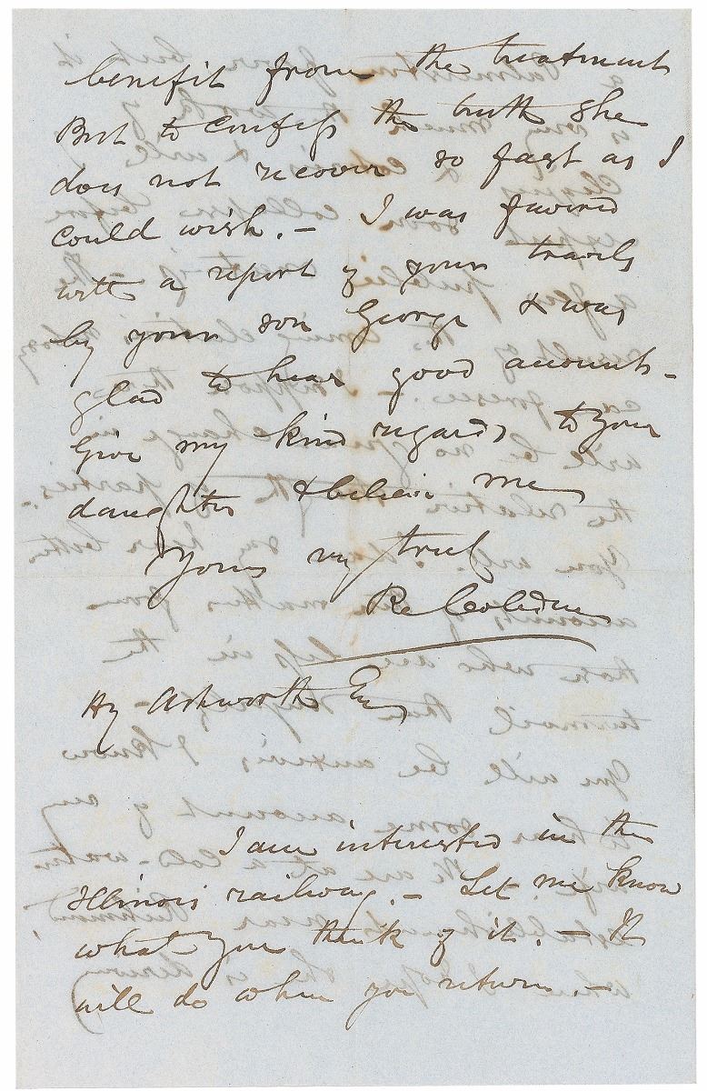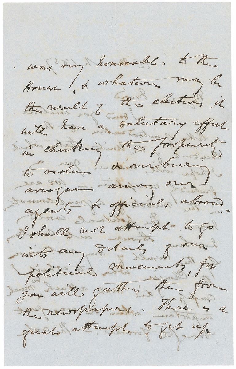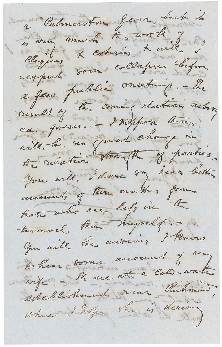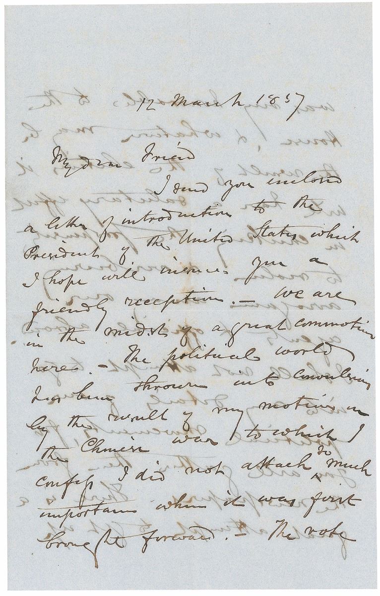 Influential British statesman (1804–1865) associated with John Bright in the formation of the Anti-Corn Law League; an immensely important figure in classical-liberal thought in economics and international affairs. ALS signed “R. Cobden,” four pages on two adjoining sheets, 5.25 x 8.25, March 12, 1857. Letter to Henry Ashworth, in part: “I send you enclosed an introduction to the President of the United States [James Buchanan]…We are in the midst of a great commotion by the result of my motion on the Chinese war to which I confess I did not attach so much importance when it was first brought forward.—The vote was very honorable to the House, & whatever may be the result of the elections it will have a salutary effect in checking the propensity to violence & over bearing arrogance among our agents & officials abroad. I shall not attempt to go into any details of our political movements, for you will gather them from the newspapers. There is a great attempt to get up a Palmerston fever, but it is very much the work of cliques & coteries & will I expect soon collapse before a few public meetings.—The result of the coming elections nobody can foresee.—I suppose there will be no great change in relative strength of parties.” Central vertical and horizontal folds and significant show-through from writing to opposing sides, otherwise fine condition. Accompanied by the original mailing envelope addressed in Cobden’s hand. In this letter, Cobden references his objection to British escalation in the Second Opium War—a position that cost him his seat in parliament in the oncoming election, but which held true to his pacifist inclinations.