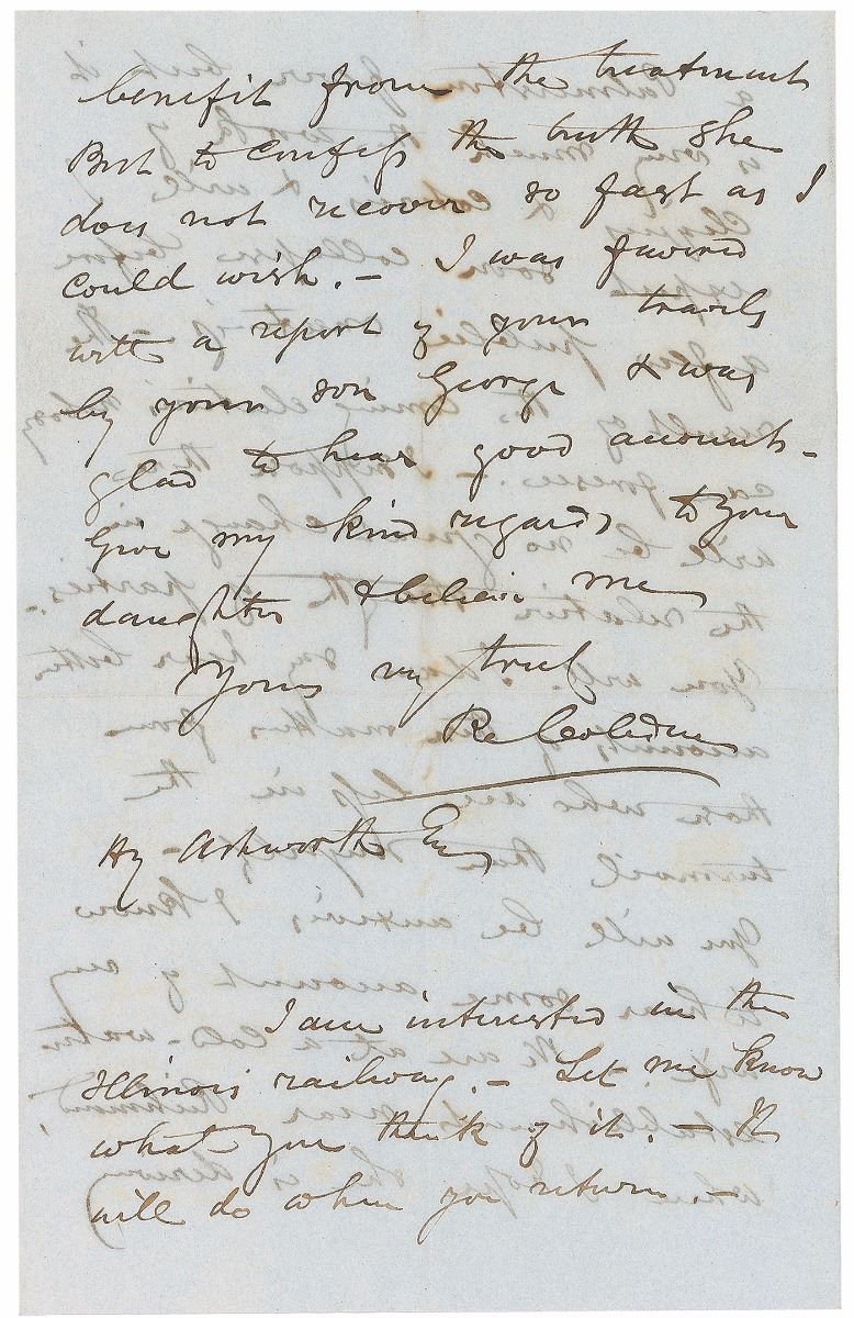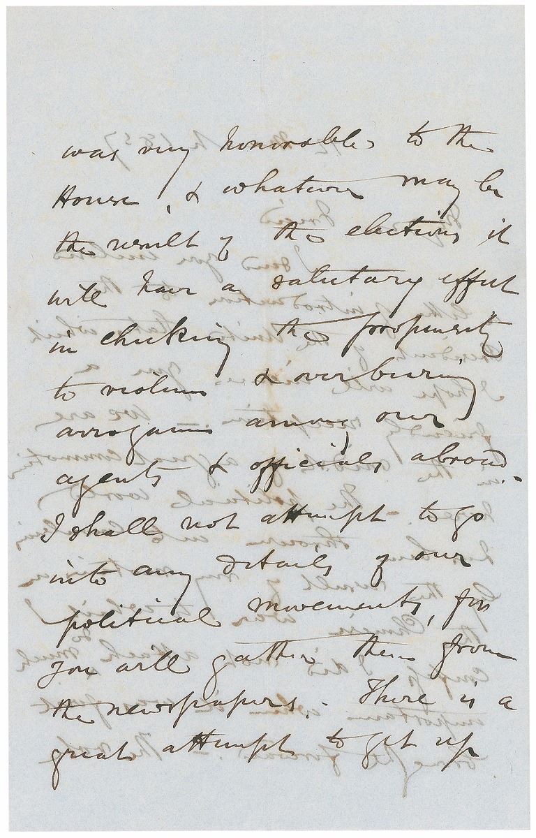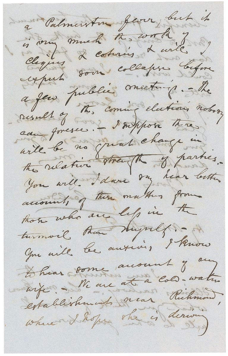 Influential British statesman (1804–1865) associated with John Bright in the formation of the Anti-Corn Law League; an immensely important figure in classical-liberal thought in economics and international affairs. ALS signed “R. Cobden,” four pages on two adjoining sheets, 5.25 x 8.25, March 12, 1857. Letter to Henry Ashworth, in part: “I send you enclosed an introduction to the President of the United States [James Buchanan]…We are in the midst of a great commotion by the result of my motion on the Chinese war to which I confess I did not attach so much importance when it was first brought forward.—The vote was very honorable to the House, & whatever may be the result of the elections it will have a salutary effect in checking the propensity to violence & over bearing arrogance among our agents & officials abroad. I shall not attempt to go into any details of our political movements, for you will gather them from the newspapers. There is a great attempt to get up a Palmerston fever, but it is very much the work of cliques & coteries & will I expect soon collapse before a few public meetings.—The result of the coming elections nobody can foresee.—I suppose there will be no great change in relative strength of parties.” In fine condition, with show-through from writing to opposing sides. Accompanied by the original mailing envelope addressed in Cobden’s hand. In this letter, Cobden references his objection to British escalation in the Second Opium War—a position that cost him his seat in parliament in the oncoming election, but which held true to his pacifist inclinations.