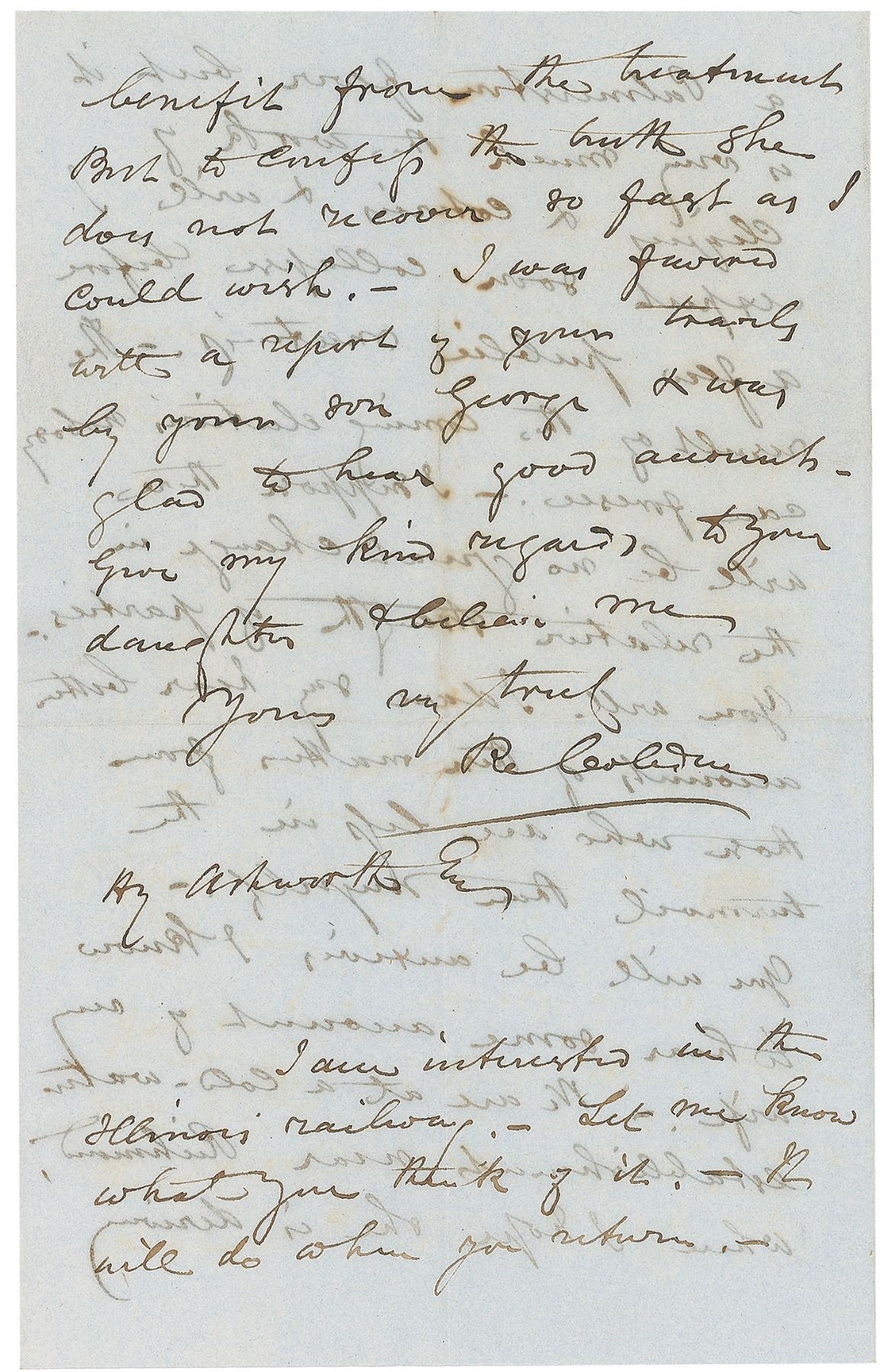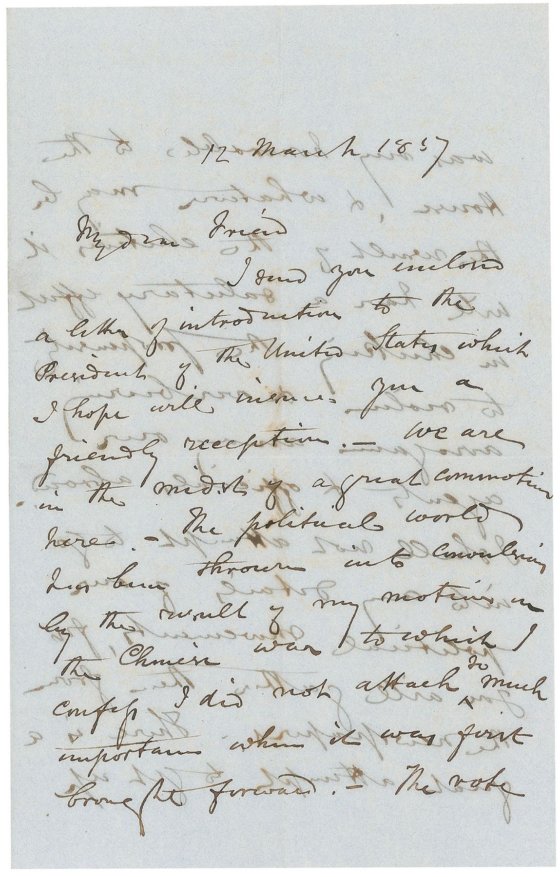 Influential British statesman (1804–1865) associated with John Bright in the formation of the Anti-Corn Law League; an immensely important figure in classical-liberal thought in economics and international affairs. ALS signed “R. Cobden,” four pages on two adjoining sheets, 5.25 x 8.25, March 12, 1857. Letter to Henry Ashworth, in part: “I send you enclosed an introduction to the President of the United States [James Buchanan]…We are in the midst of a great commotion by the result of my motion on the Chinese war to which I confess I did not attach so much importance when it was first brought forward.—The vote was very honorable to the House, & whatever may be the result of the elections it will have a salutary effect in checking the propensity to violence & over bearing arrogance among our agents & officials abroad. I shall not attempt to go into any details of our political movements, for you will gather them from the newspapers. There is a great attempt to get up a Palmerston fever, but it is very much the work of cliques & coteries & will I expect soon collapse before a few public meetings.—The result of the coming elections nobody can foresee.—I suppose there will be no great change in relative strength of parties.” In fine condition, with show-through from writing to opposing sides. Accompanied by the original mailing envelope addressed in Cobden’s hand. In this letter, Cobden references his objection to British escalation in the Second Opium War—a position that cost him his seat in parliament in the oncoming election, but which held true to his pacifist inclinations.