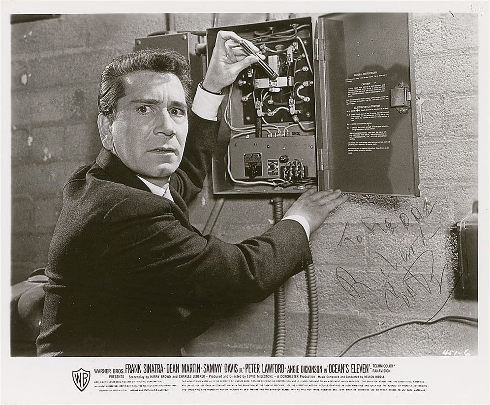American actor (1910–1975) who appeared in more than 100 films and is best remembered for his roles in noir films like Whirlpool and The Blue Gardenia, as well as Ocean's 11 and The Godfather. Glossy 10 x 8 Warner Brothers publicity photo of Conte as Tony Bergdorf in the 1960 heist film Ocean’s Eleven, signed and inscribed in black ballpoint, “To Pierre, Richard Conte.” In fine condition, with a few trivial creases and surface impressions to the top right.