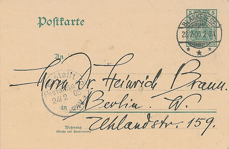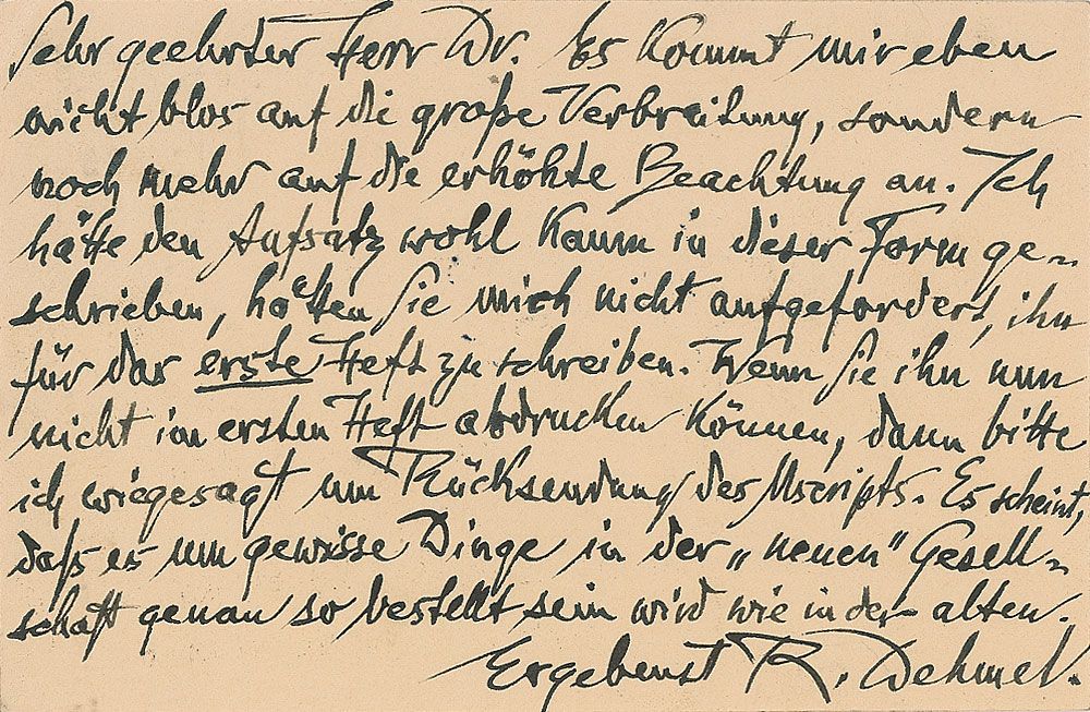 German poet and writer (1863–1920). Untranslated ALS in German, signed “R. Dehmel,” one page, 5.5 x 3.75, no date, but postmarked February 23, 1905. Letter to Dr. Friedrich Braun. In fine condition.