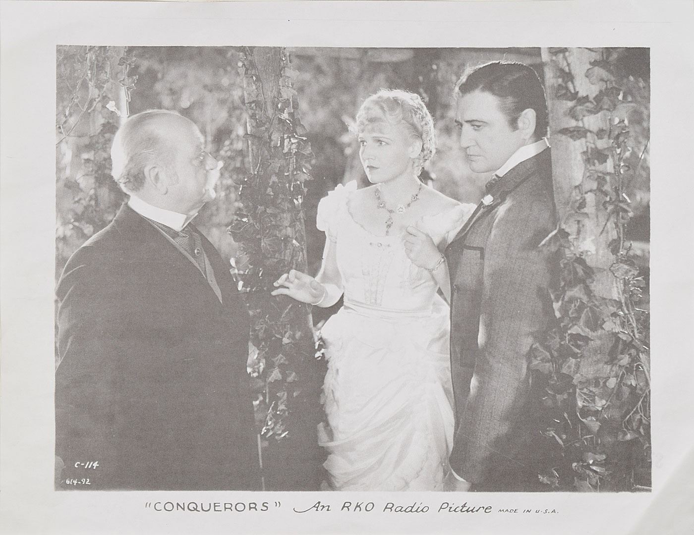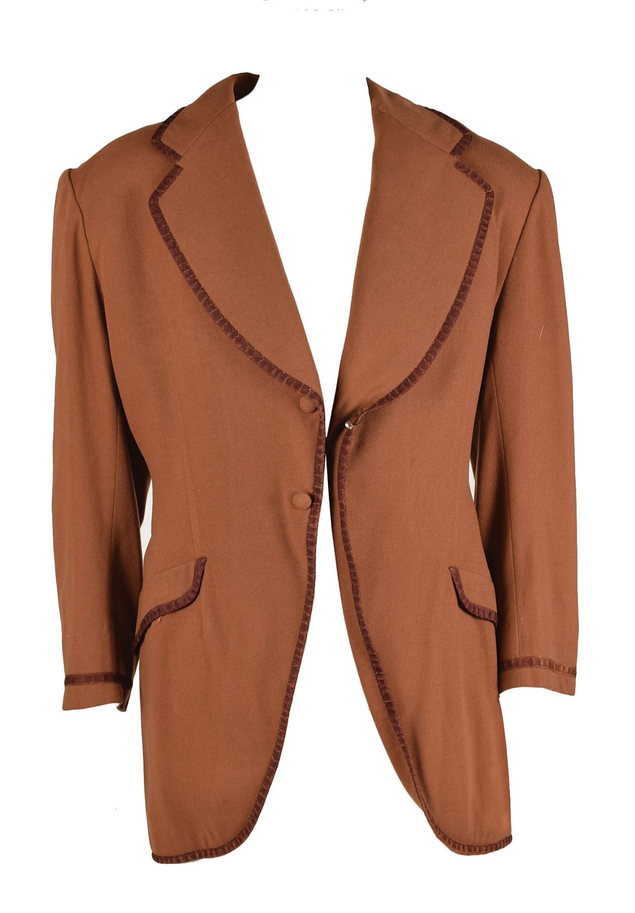 Brown double-breasted cutaway coat, worn on screen by Richard Dix in his role as Roger Standish in the 1932 western The Conquerors. The brown wool coat, size 44, features shoulder pads and an olive green satin lining, with the collar area marked “Char” and bearing a Western Costume Company stamp and a “Cutaway Double, #502” stamp. The right cuff bears an affixed slip, numbered: “48, 21.” With the exception of loose stitching to hem and fraying to back of collar, the outside of coat is in fine condition; the inner lining is loose and partially torn near collar and seams. An attractive period coat worn by the Oscar-nominated leading man.