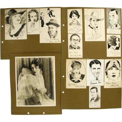 <B>Richard Dix and Others Signed Original Celebrity Sketches and Photos.</B></I> A selection of 15 small pen-and-ink sketches of various celebrities from the Golden Age of Hollywood, including Richard Dix, Betty Blythe, Janet Gaynor, Ken Maynard, and others, signed by their respective subjects and affixed to an 11.5" x 9.5" photo album page. Also included is a page with autographed vintage b&w photos of Dorothy Ward, Evelyn Laye, and Olive Borden affixed to it. The drawings are by artist Robert L. Whittington. In overall Very Fine condition with occasional instances of toning and/or soiling.<BR><BR><b>Shipping:</b> Flat Material, Small (<a target="_blank" href="http://www.heritageauctions.com/common/shipping.php">view shipping information</a>)