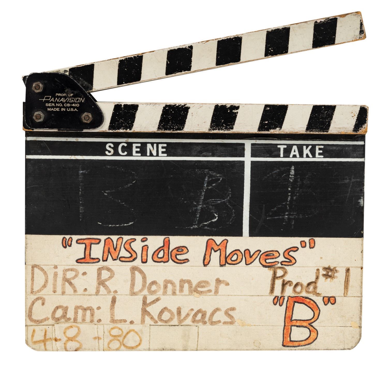 (ITC/Associated Film, 1980) Richard Donner's production clapperboard for his 1980 drama, "Inside Moves." Richard Donner is a premier American director best known for Superman and the Lethal Weapon series. Fired from Superman II, Donner turned to Inside Moves as "The smallest film I could do that was just very near and dear to me." Measuring 9"x11"the clapperboard is in good, set-used condition exhibiting scuffs and wear to edges and wood parts.