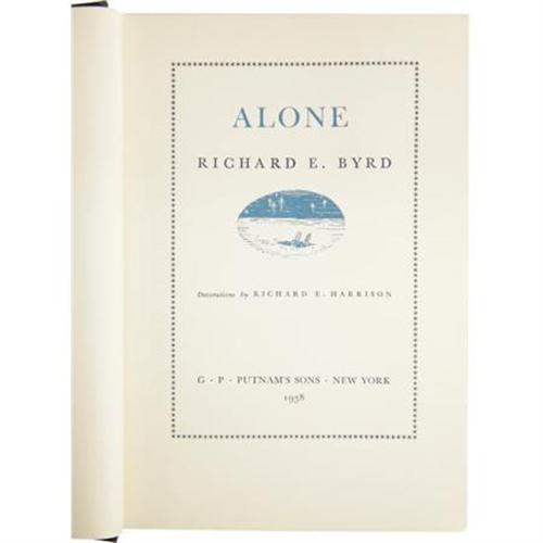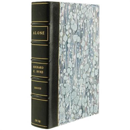 <B>Richard E. Byrd: Signed Edition of <I>Alone</B></I>.</B></I> (New York: G. P. Putnam's Sons, 1938), third impression, 296 pages, dark blue cloth with light blue lettering on the spine and front board, 8vo (5.5" x 8.25"), no dust jacket, clear plastic protective sleeve on boards, housed in a blue quarter leather slipcase with marbled boards and gilt titles & five raised bands on the spine. Signed "<I>R E Byrd</B></I>" on the front free endpaper. The book is in very good condition, with the boards moderately soiled, spine shelf-cocked, and minor shelf wear. The textblock is clean and tight. A scarce chance to obtain a signed Byrd book.<BR><BR><b>Shipping:</b> Books & Catalogs (<a target="_blank" href="http://www.heritageauctions.com/common/shipping.php">view shipping information</a>)