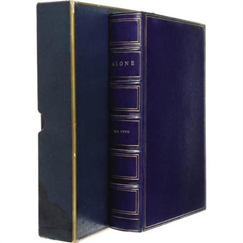 <B>Richard E. Byrd Signed Limited Edition Book: </B></I><B><I>Alone</B></I></B></I><B>.</B></I> (New York: G. P. Putnam's Sons, 1938), limited numbered edition (#129 of 225) on rag paper, 296 pages, blue morocco gilt with compartmented spine, marbled endpapers, 8vo (6" x 8.5"), signed on the limitation page "<I>R E Byrd</B></I>". Early publicity for this book states, "This is the book that Admiral Byrd was four years deciding whether to write- the account of an experience so intimate- and perhaps so catastrophic- that for a long time he could not bring himself to tell it... the account of Byrd's five months' isolation at Advance Base... where in 1934 he nearly died." Fine condition in original glassine dust jacket. Custom blue and gilt box has some light wear.<BR><BR><b>Shipping:</b> Books & Catalogs (<a target="_blank" href="http://www.heritageauctions.com/common/shipping.php">view shipping information</a>)