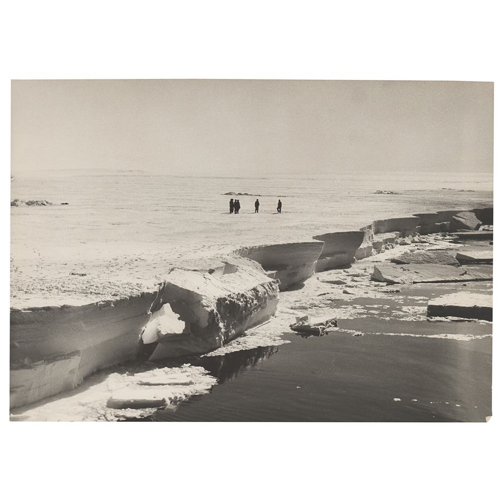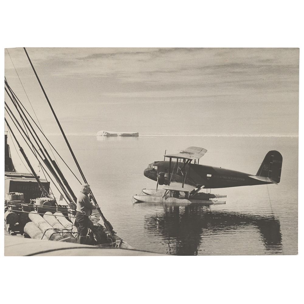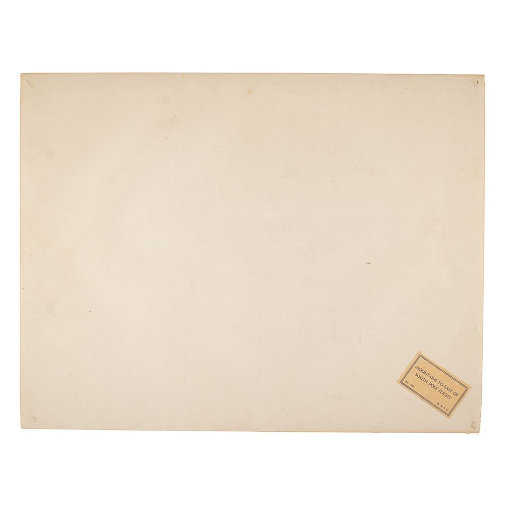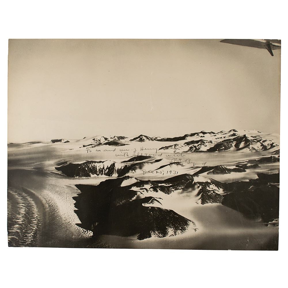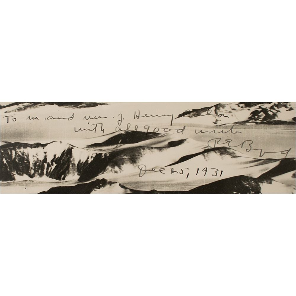 Fantastic matte-finish 17.75 x 13.5 photo, signed and inscribed in fountain pen, "To Mr. and Mrs. J. Henry Colon, With all good wishes, R. E. Byrd, Dec. 25, 1931." Also faintly signed in the lower right by the photographer, "A. C. McKinley." A tag affixed to the reverse reads, "Mountains to East of South Pole Flight, No. 29, Copyright B. A. E." In very good condition, with horizontal fold passing through the center, a few noticeable surface impressions, and slightly trimmed edges; overall the image remains very visually appealing. Also accompanied by two unsigned oversized vintage photos of the South Pole expedition. This marvelous photograph shows the desolate Antarctic landscape that Byrd faced during his first expedition, captured by McKinley during the famous 1929 flight that made them the first men to fly over the South Pole. Stunning in size and subject, it is a choice Byrd piece.