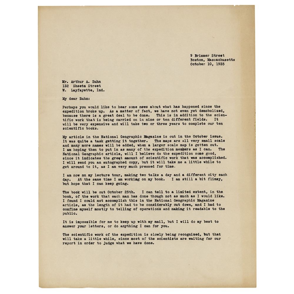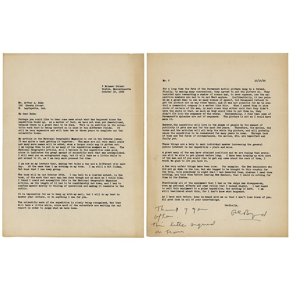 TLS signed “R. E. Byrd,” two pages, 8.5 x 11, October 10, 1935. Letter to Arthur A. Zuhn, physicist with the Byrd Antarctic Expedition in 1933–35, in part: “Perhaps you would like to hear some news about what has happened since the expedition broke up. As a matter of fact, we have not even yet demobolized [sic], because there is a great deal to be done. This is in addition to the scientific work that is being carried on in nine or ten different fields. It will be very expensive and will take two or three years to complete our ten scientific books.