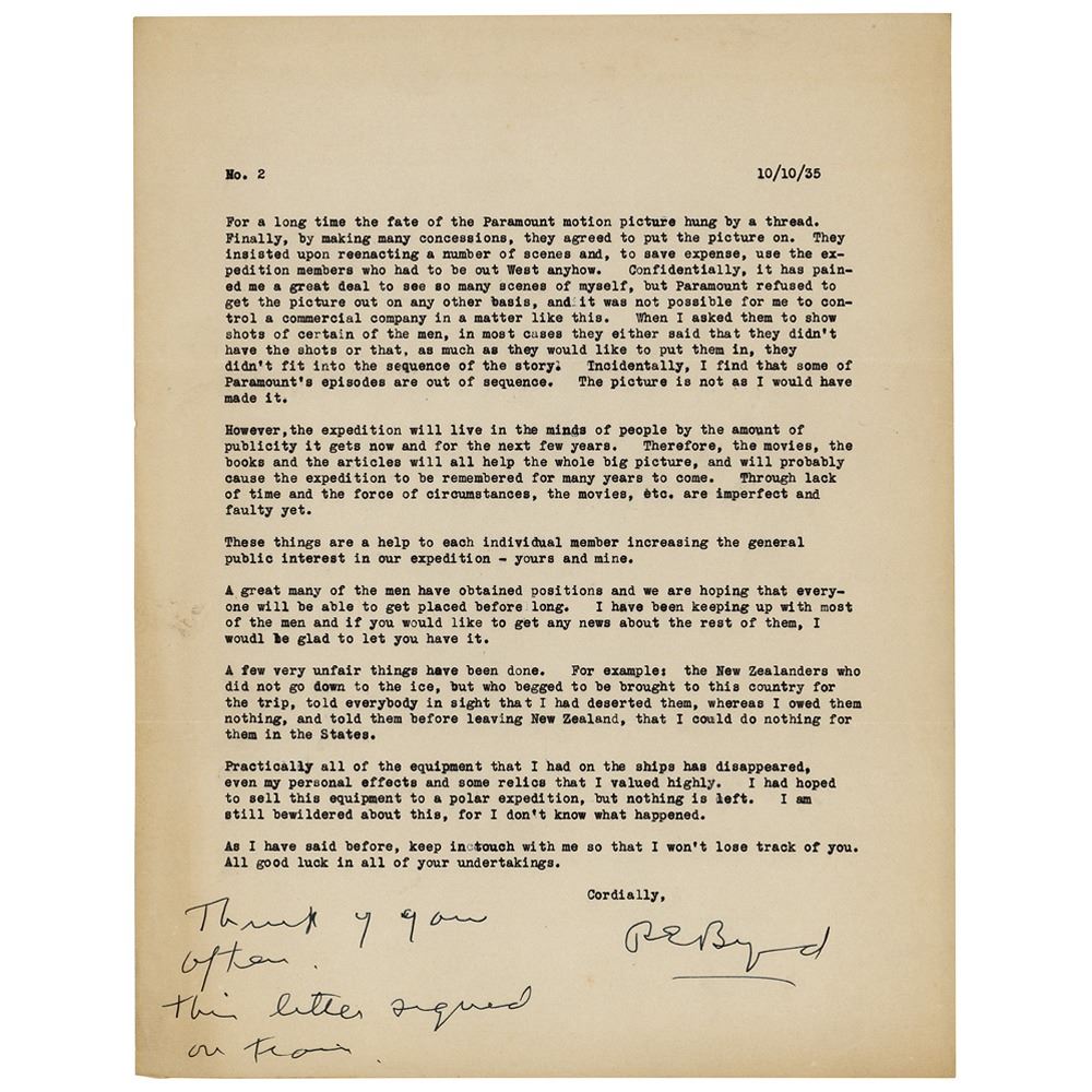 A few very unfair things have been done…Practically all of the equipment that I had on the ships has disappeared, even my personal effects and some relics that I valued highly. I had hoped to sell this equipment to a polar expedition, but nothing is left. I am still bewildered about this, for I don't know what happened.” Byrd adds a brief handwritten postscript: “Think of you often. This letter signed on train.” In fine condition, with toning to the edges.