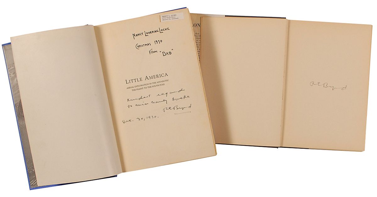 Two hardcover books: a first edition of Little America, signed and inscribed on the half-title page, “Kindest regards to Miss Nancy Locke, R. E. Byrd, Dec. 30, 1930,” and also bearing a gift presentation; and Alone, signed on the third free end page, “R. E. Byrd.” In overall very good condition.