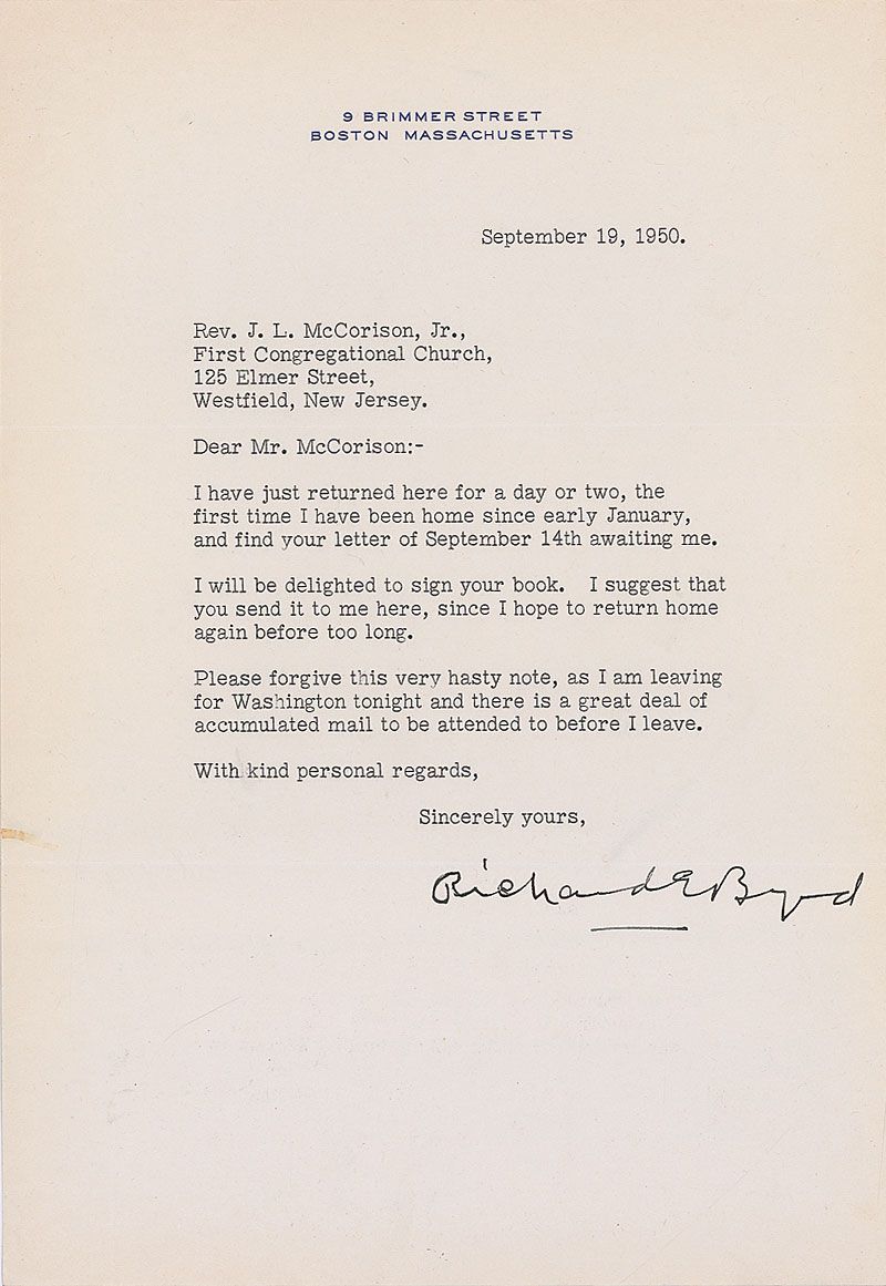 TLS signed “Richard E. Byrd,” one page, 7.25 x 10.5, personal letterhead, September 19, 1950. Letter to an admirer. In part: “I will be delighted to sign your book. I suggest that you send it to me here, since I hope to return home again before too long.” In fine condition. An uncommon full signature from the polar explorer.