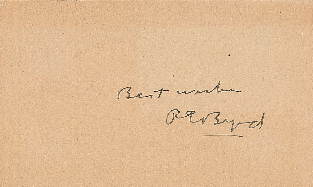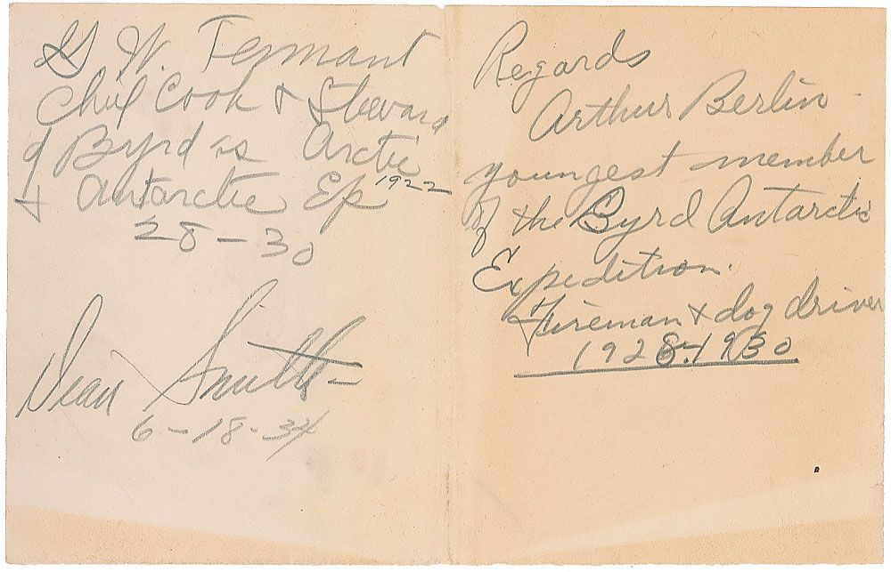 Two items: one ink signature, “Best wishes, R. E. Byrd,” on an off-white 5 x 3 card; and pencil signatures of three members of his expedition—Dean Smith, G. W. Tennant, and Arthur Berlin—on an off-white 8.5 x 5.5 sheet. Scattered toning, otherwise fine condition.