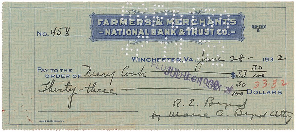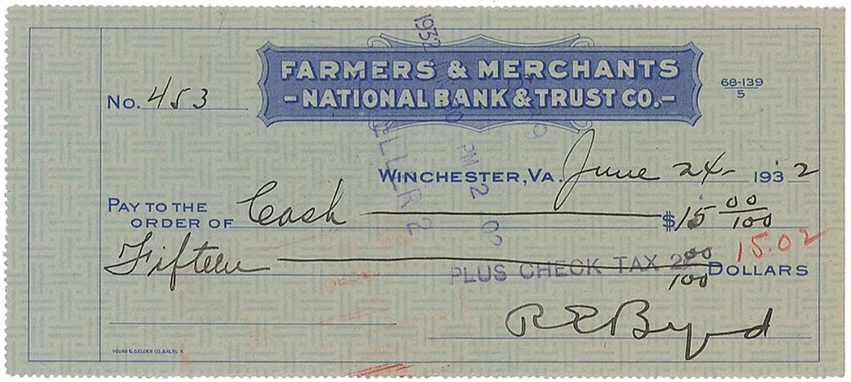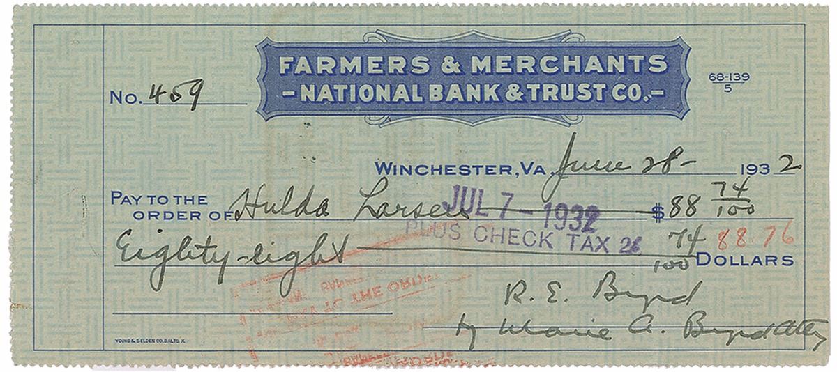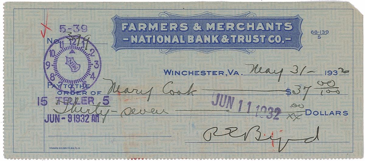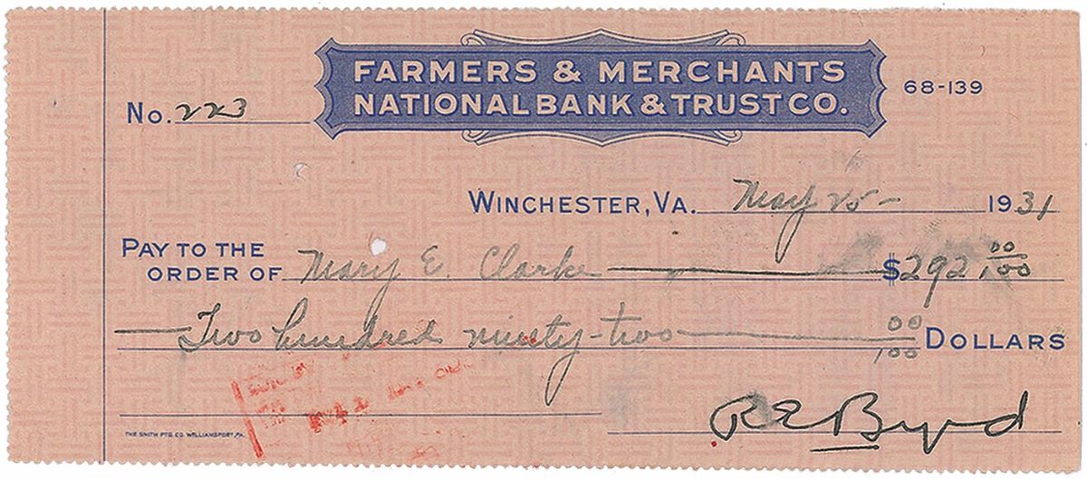 Set of three Farmers & Merchants National Bank & Trust Co. checks, 6.25 x 2.75, filled out in another hand and signed by Byrd, “R. E. Byrd,” dated between 1931 and 1932. Vertical folds, creasing, expected bank notations, cancellation holes, and stamps, and smudging to a single letter of one signature, otherwise overall fine condition. Accompanied by two checks filled out and signed by his wife, Marie A. Byrd.