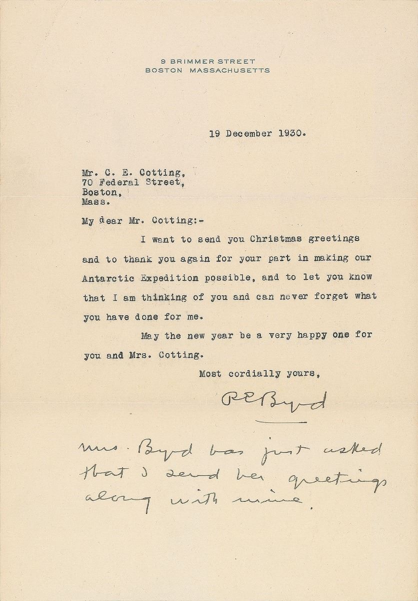 TLS signed “R. E. Byrd,” one page, 7.25 x 10.25, personal letterhead, December 19, 1930. Letter to C. E. Cotting, in part: “I want to send you Christmas greetings and to thank you again for your part in making our Antarctic Expedition possible, and to let you know that I am thinking of you and can never forget what you have done for me.” He adds a handwritten postscript, “Mrs. Byrd has just asked that I send her greetings along with mine.” In fine condition, with creasing to the corners.