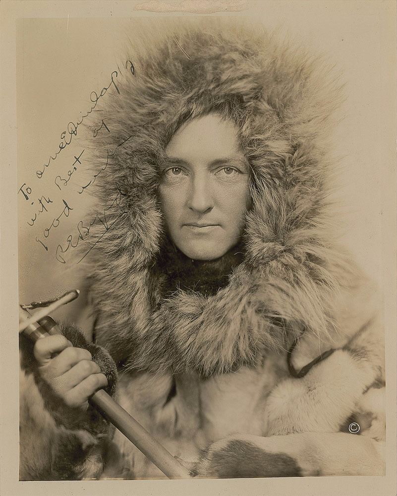 Fantastic vintage semi-glossy 8 x 10 close-up photo of Byrd wearing a warm fur coat, signed and inscribed in fountain pen, "To Orne E. Dunlap, Jr., with Best of good wishes, R. E. Byrd.” Reverse bears a Wide World Studio stamp. In fine condition, with some old adhesive residue in the top border. Accompanied by a full letter of authenticity from JSA.