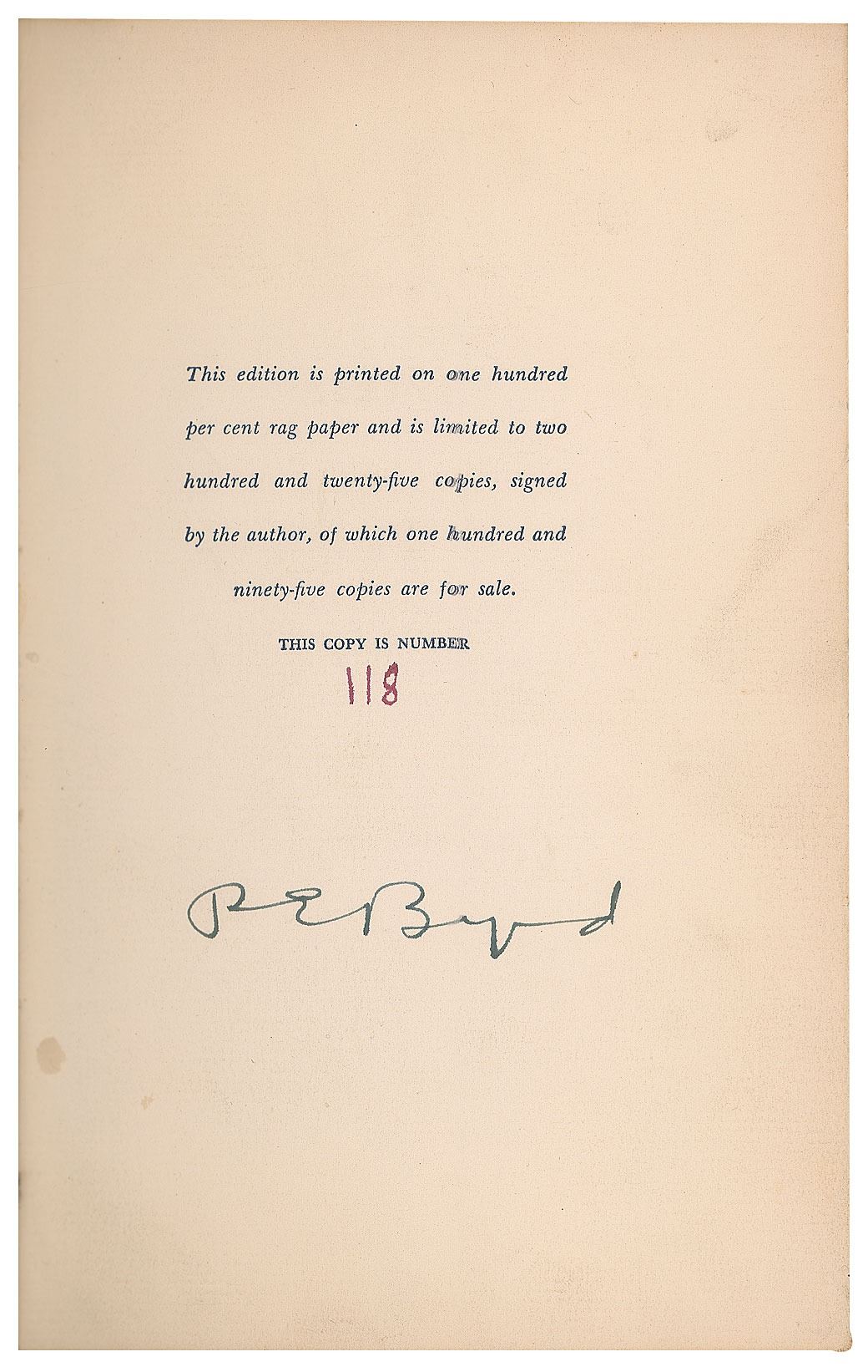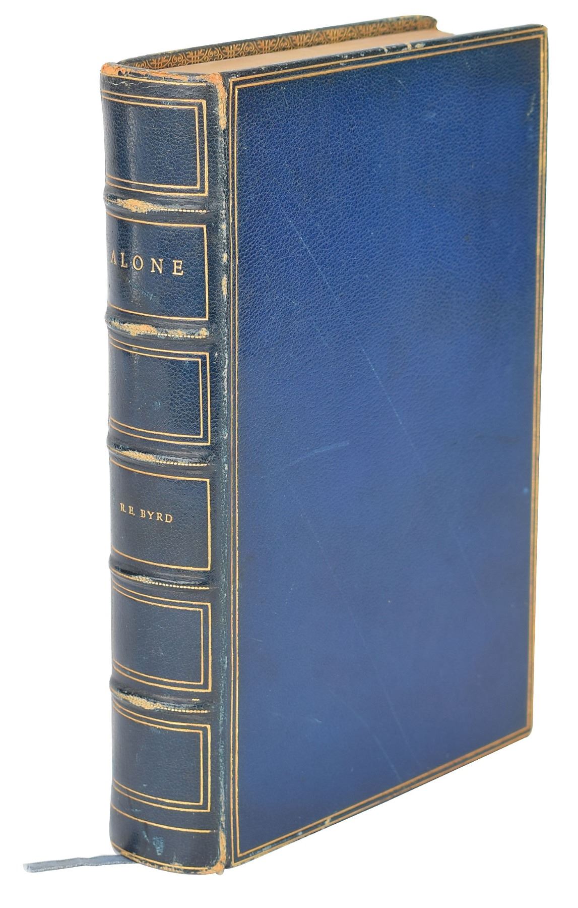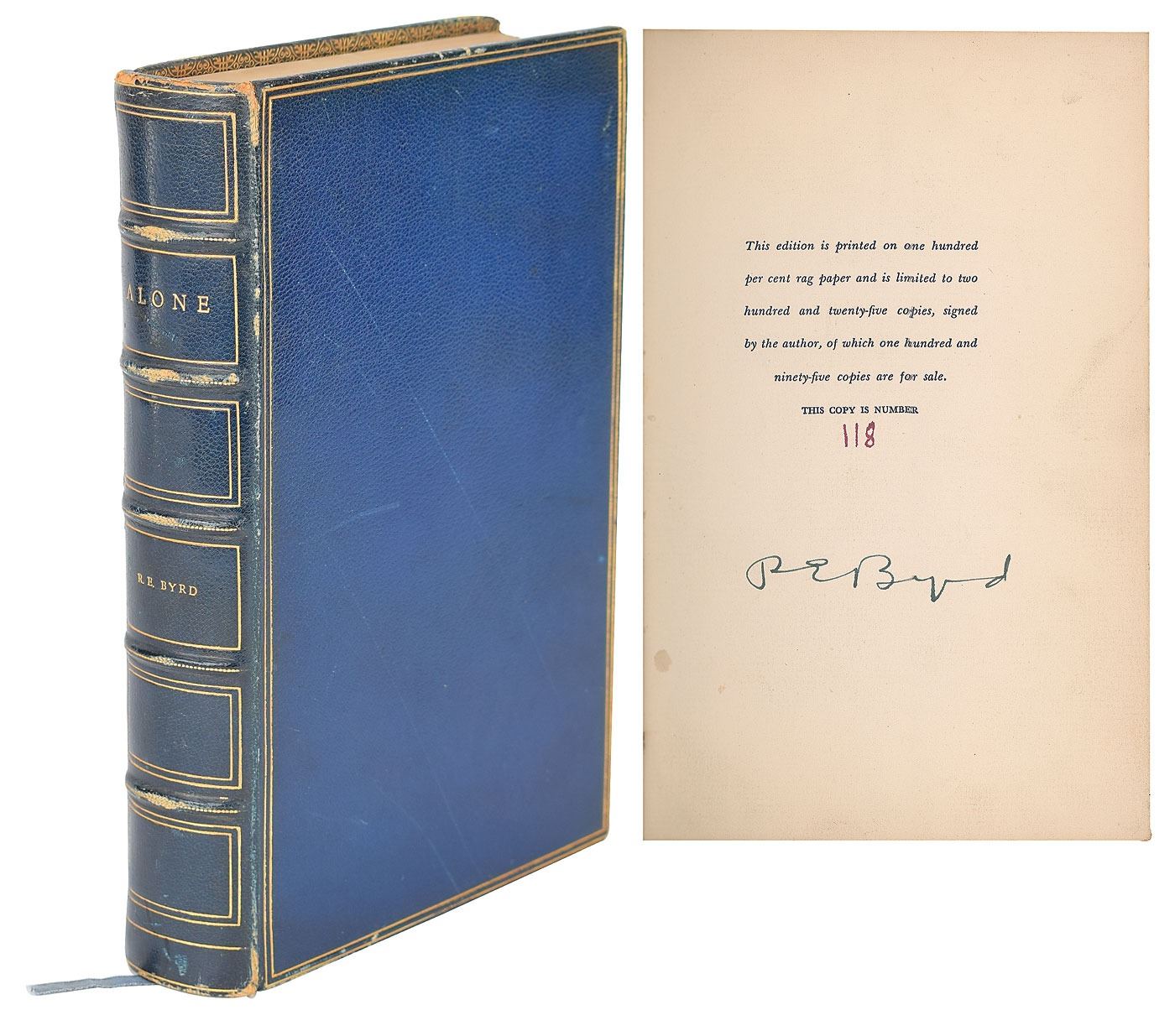 Signed book: Alone. Limited first edition, numbered 118/225. NY: G. P. Putnam's Sons, 1938. Leatherbound hardcover, 5.75 x 8.5, 296 pages. Signed boldly on the colophon in fountain pen, "R. E. Byrd." In fine condition, with light rubbing to the spine, and a former owner's bookplate to the front pastedown.