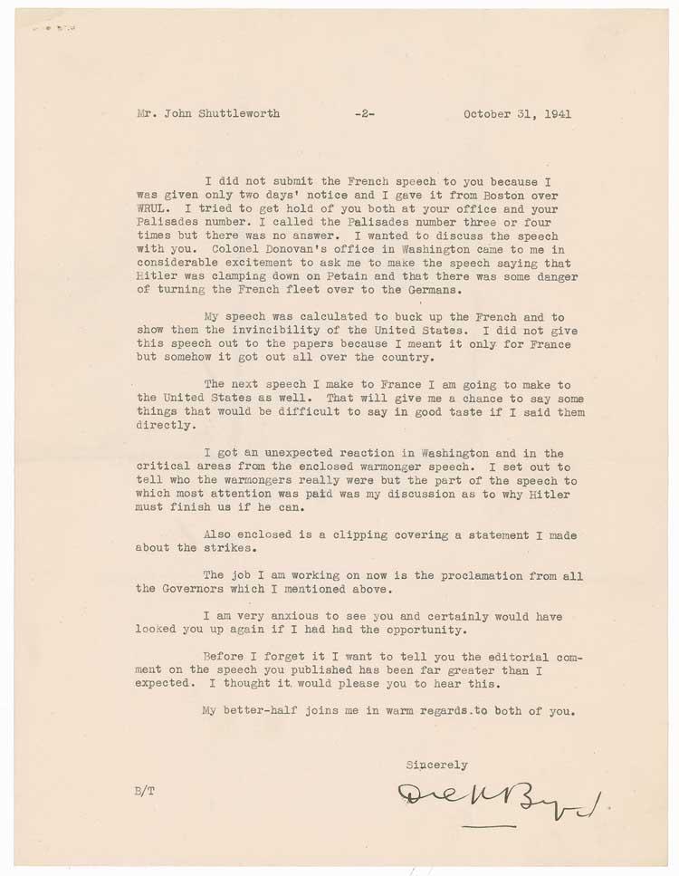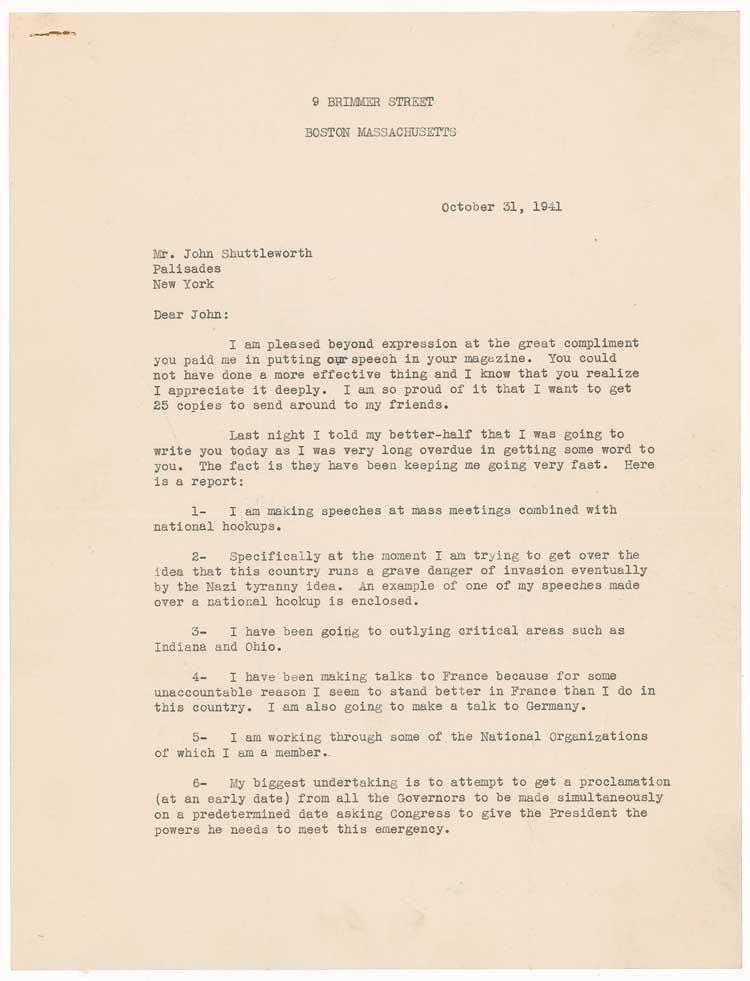 “2- Specifically at the moment I am trying to get over the idea that this country runs a grave danger of invasion eventually by the Nazi tyranny idea. An example of one of my speeches made over a national hookup is enclosed.