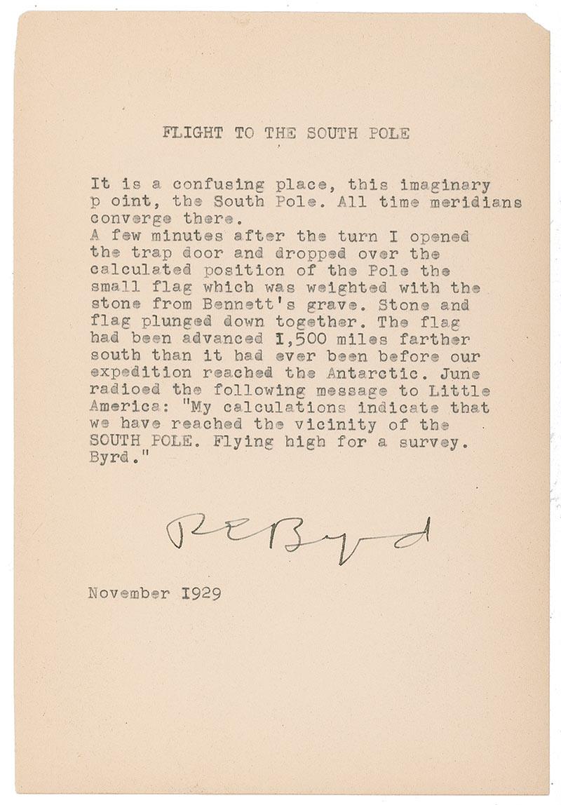 Souvenir TQS, signed “R. E. Byrd,” on an off-white 5.25 x 7.5 card. In full: “It is a confusing place, this imaginary point, the South Pole. All time meridians converge there. A few minutes after the turn I opened the trap door and dropped over the calculated position of the Pole the small flag which was weighted with the stone from Bennett’s grave. Stone and flag plunged down together. The flag had been advanced 1,500 miles father south than it had ever been before our expedition reached the Antarctic. June radioed the following message to Little America: ‘My calculations indicate that we have reached the vicinity of the SOUTH POLE. Flying high for a survey. Byrd.’” Signed underneath in fountain pen with the typewritten date November 1929. Missing small upper right corner tip, otherwise fine condition. Fabulous quotation as the explorer recalls his famed adventure.