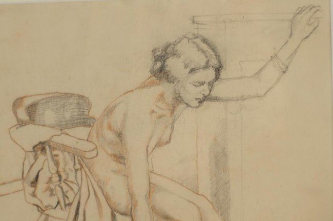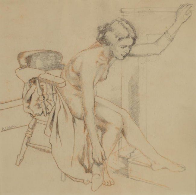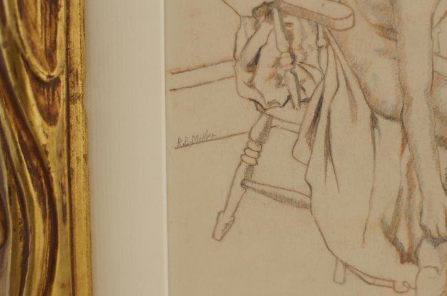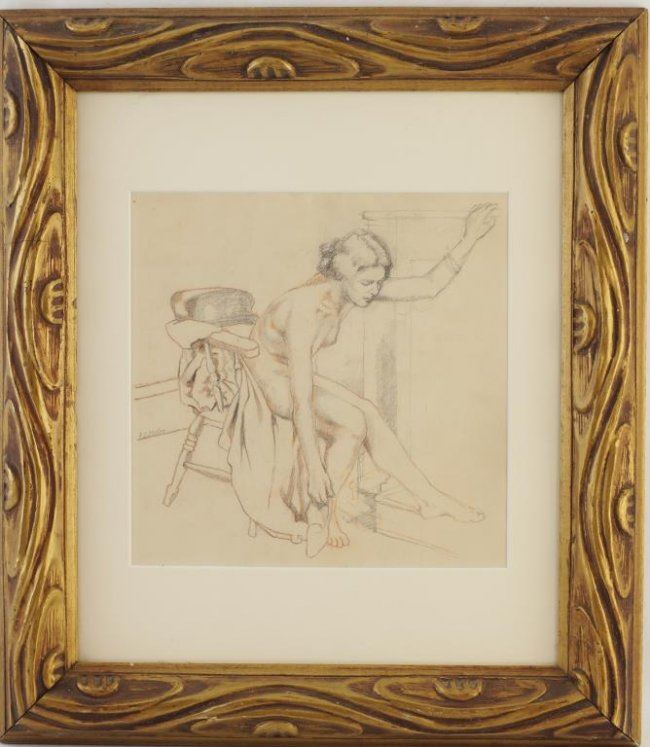 girl on chair, pencil, charcoal, colored pencil measures 8.5"x8.5" signed right, pencil