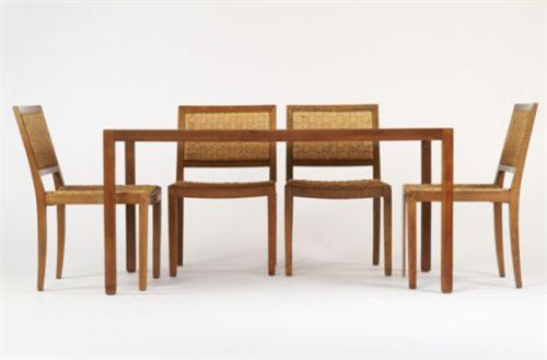 Richard Fahnkow dining set Germany, c. 1930 beech, bleached mahogany, jute 57 w x 25.5 d x 27.5 h inches Set includes table and four chairs. Provenance: Dr. Alice Ettinger, Berlin | Sotheby's, sale 7068, lots 483 & 485 | Private collection