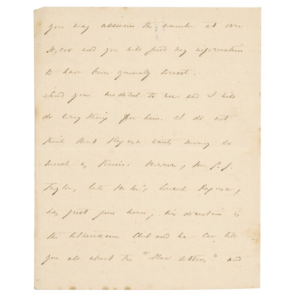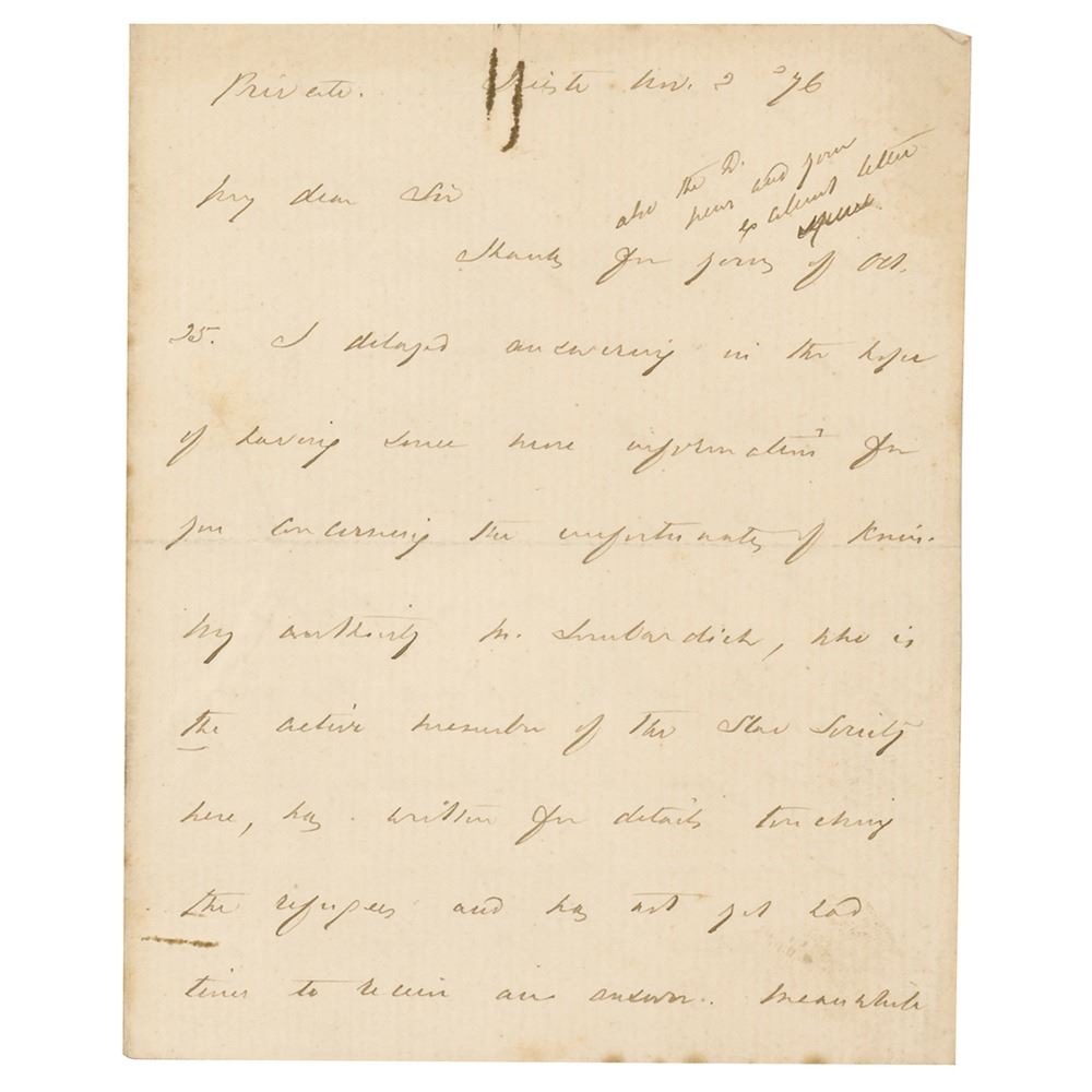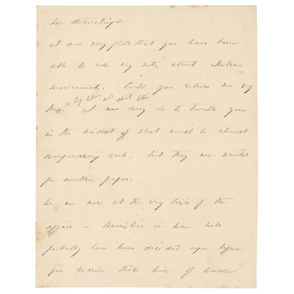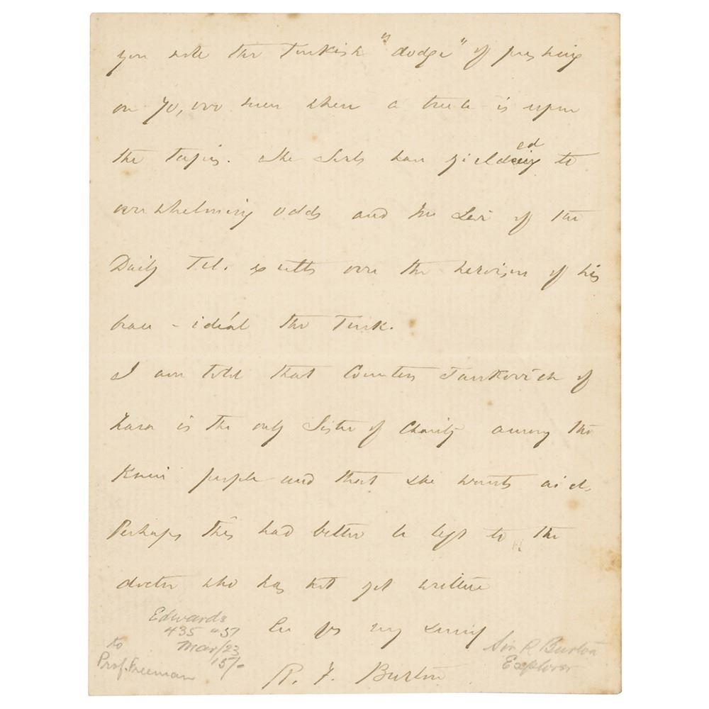 Rare ALS signed ‰ÛÏR. F. Burton,‰Û four pages on two adjoining sheets, 4 x 5, November 2, 1876. Letter to Edward Augustus Freeman, penned in his difficult-to-read hand, in part: "Thanks for yours of Oct. 25. I delayed answering in the hope of having some more information for you concerning the unfortunates of Kuni. My authority M. Lombardich, who is the active member of the Slav Society here, has written for details touching the refugees and has not yet had time to receive an answer. Meanwhile, you may assume the number at over 10,000 and you will find my information to have been generally correct. Send your medical to me and I will do everything for him‰Û_I am very glad that you have been able to use my notes‰Û_Could you return me Mss, 2 long letters and short letter? I am sorry to trouble you in the midst of what must be almost overpowering work, but they are wanted for another paper. We are now at the very crisis of the affair‰ÛÓarmistice or war will probably have been decided upon before you receive these lines. Of course you note the Turkish ‰Û÷dodge‰Ûª of pushing on 70,000 men‰Û_I am told that Countess Jankovich‰Û_is the only Sister of Charity among the Kuni people and that she wants aid. Perhaps this had better be left to the doctor who has not yet written." In fine condition, with scattered light foxing, and a rusty paperclip impression to the top edge of the first page.