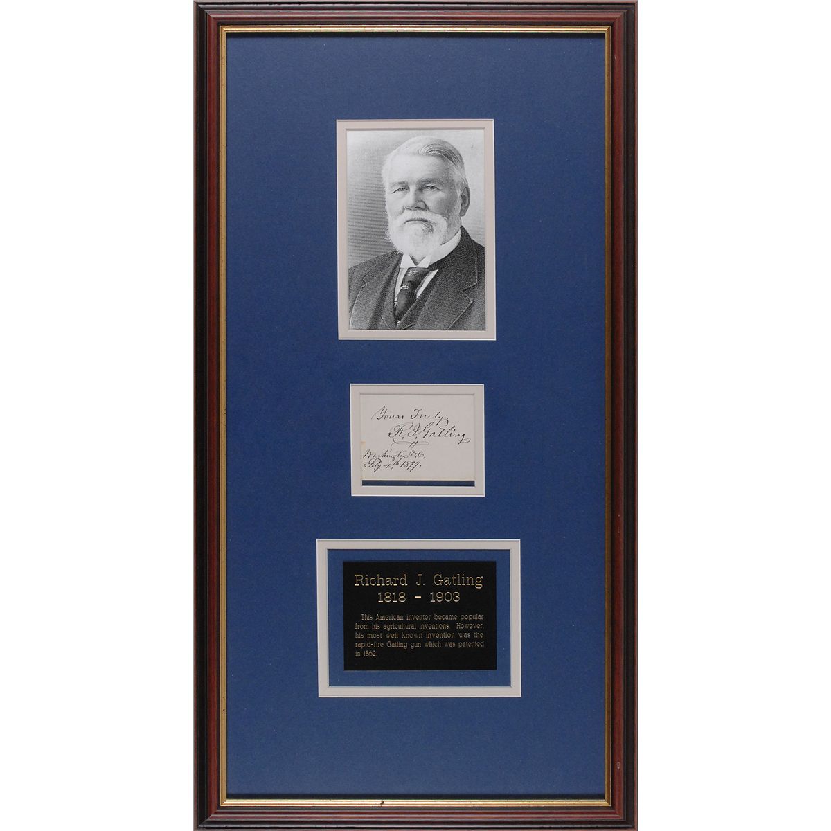 Inventor of the eponymous machine gun which has been estimated to have killed over 250,000 men since 1862. Fantastic ink signature, “Yours truly, R. J. Gatling, Washington, D. C., Feb’y 4th, 1899,” on a 3.5 x 3 card. Attractively double-matted and framed with an engraved portrait and a biographical plaque to an overall size of 14.5 x 27. In fine condition, with small spot of soiling to left edge slightly affecting a single letter of location.