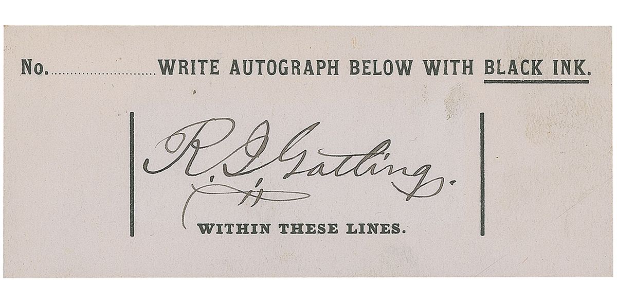 Inventor (1818–1903) of the eponymous machine gun which has been estimated to have killed over 250,000 men since 1862. Ink signature, “R. J. Gatling,” on an off-white 4.75 x 2 slip. In fine condition.