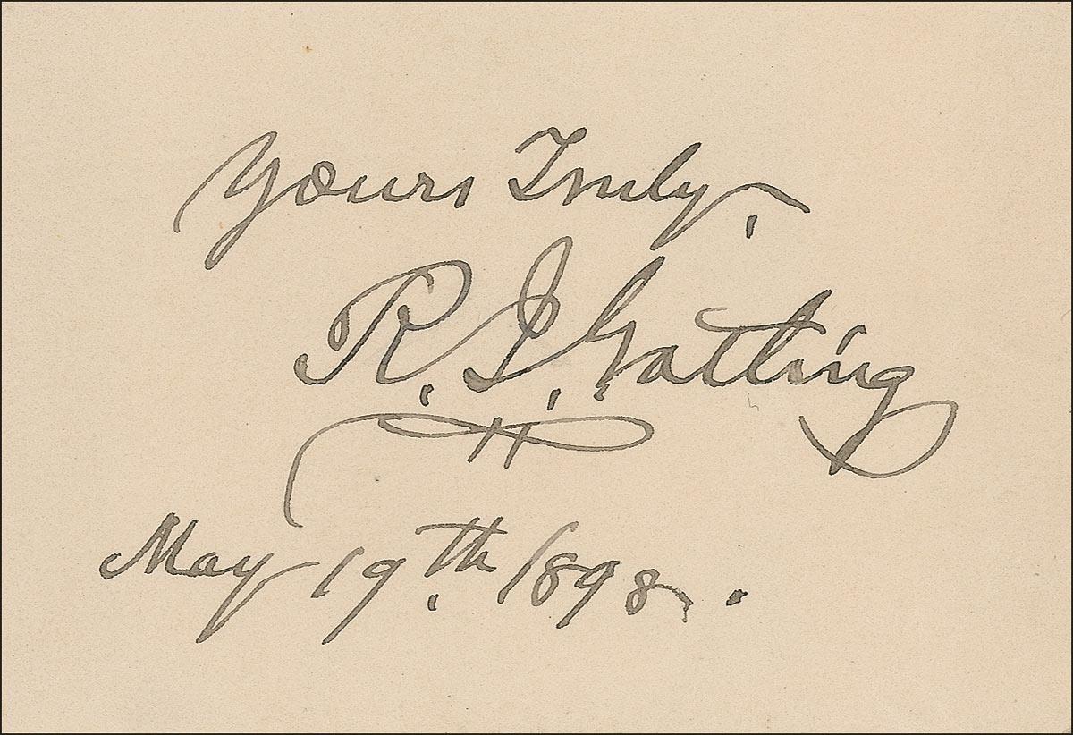 Inventor of the eponymous machine gun which has been estimated to have killed over 250,000 men since 1862. Choice ink signature, “Yours truly, R. J. Gatling, May 19th, 1898,” on an off-white 3.5 x 2.5 clipped slip. In fine condition. Pre-certified PSA/DNA and RRAuction COA.