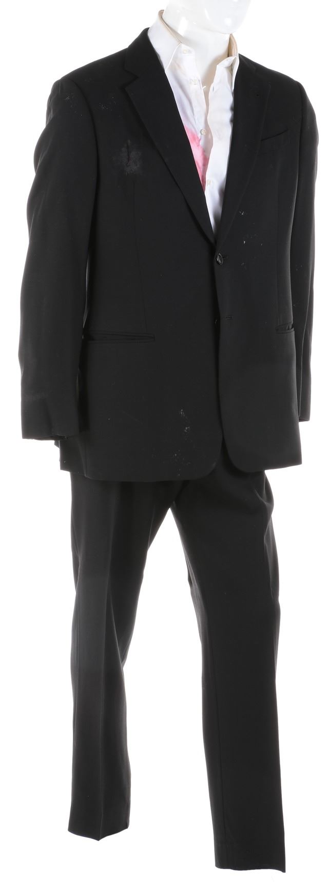 417. Richard Gere "Paul Shepherdson" death scene ensemble from The Double.(Image Entertainment, 2011) Original (3) piece Armani brand ensemble including (1) black wool suit coat with short collar, notched lapel, 3-slash pockets, and remnants of SFX blood with squib set up, including interior black tape which held it in place, (1) pair matching trousers with zipper front closure, and (1) white button-up with "bullet hole", SFX blood and makeup on collar. Retaining costumer's oak tag handwritten, "Paul Sc:122 Gunshot and Fight sequence". Exhibiting intentional studio distress, soiling, and SFX blood. In very good condition. $400 - $600