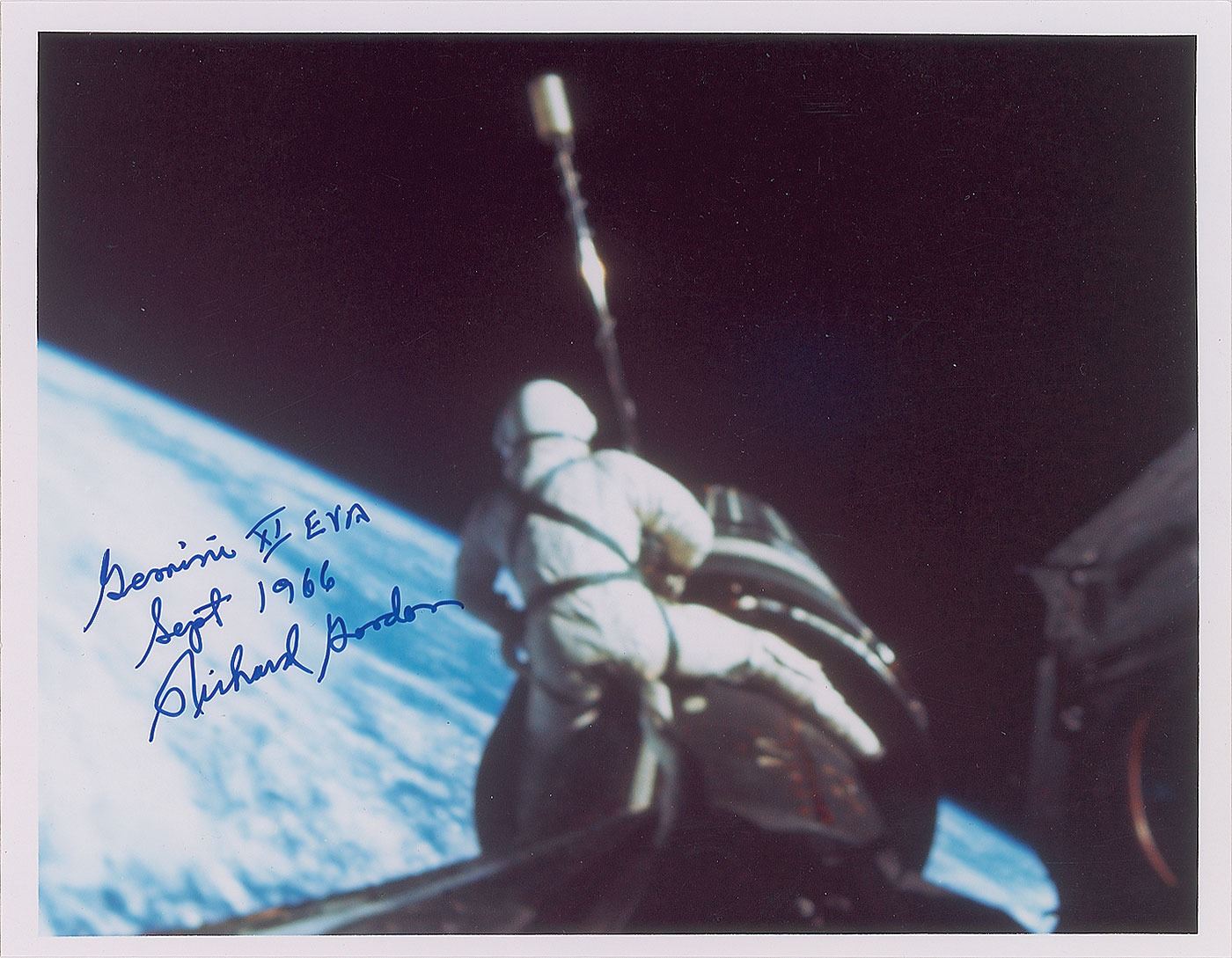 Two items: an AQS on an off-white 6 x 4 card, signed in black ballpoint, "Richard Gordon," which reads, in full: "'Not because they are easy but because they are hard,' JFK in going to the moon"; and a color glossy 10 x 8 photo of Gordon performing a spacewalk during the Gemini 11 mission, signed in blue felt tip, "Gemini XI EVA, Sept 1966, Richard Gordon." Reverse of photo bears an affixed label from The Spacesource. In overall fine condition.