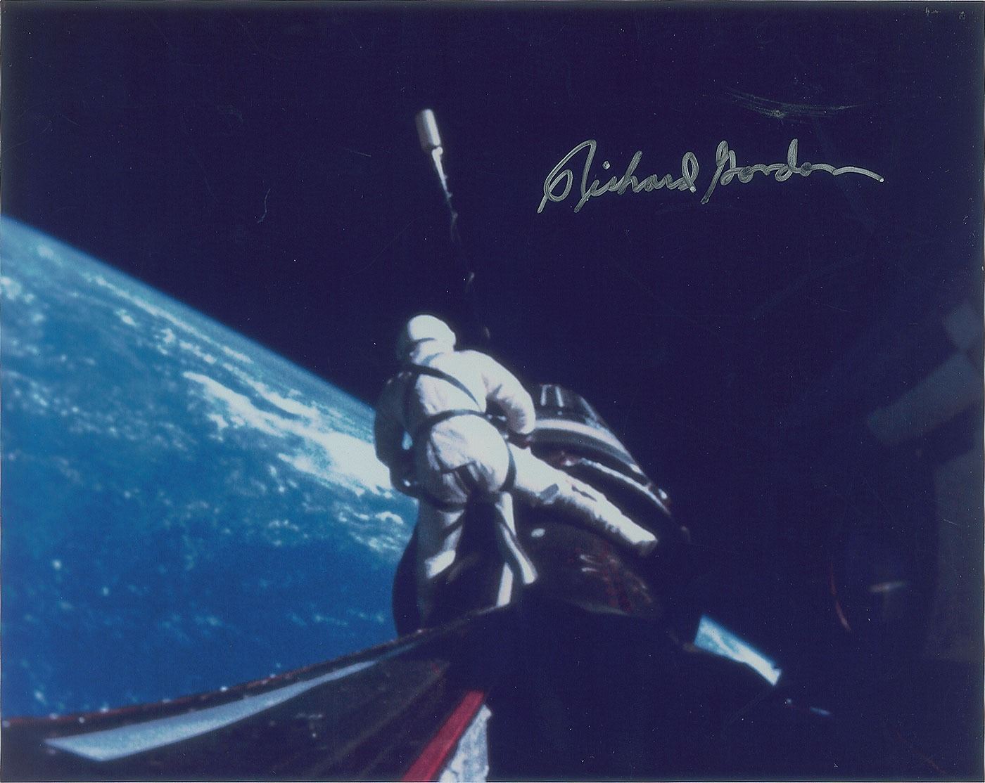 Color glossy 10 x 8 full-length photo of Richard Gordon performing his 'rodeo' EVA during the Gemini 11 mission, signed in silver ink. In fine condition, with scattered light creases and surface marks.