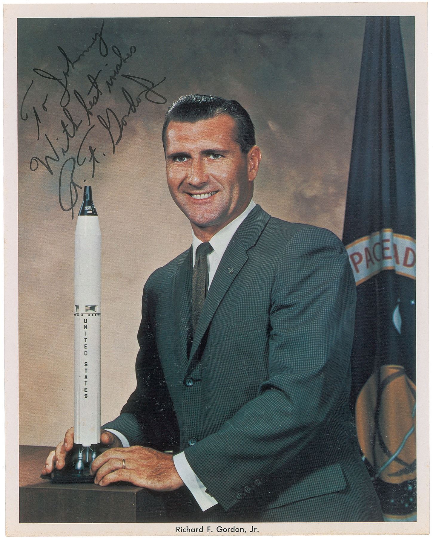 Uncommon official color 8 x 10 NASA lithograph of the Apollo 12 command module pilot posing with a rocket model, signed and inscribed in black felt tip, "To Johnny, With best wishes, R. F. Gordon, Jr.” In fine condition.