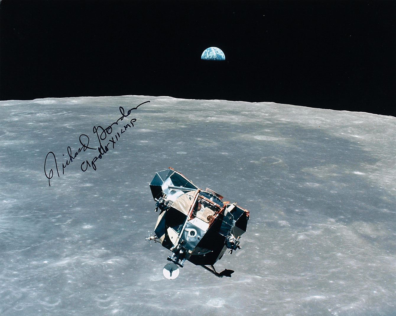 Gorgeous color satin-finish 14 x 11 photo of the Apollo 12 lunar module Intrepid making its ascent from the lunar surface, signed in black felt tip, "Richard Gordon, Apollo XII LMP." In fine condition. Accompanied by a photo taken at the time of signing.