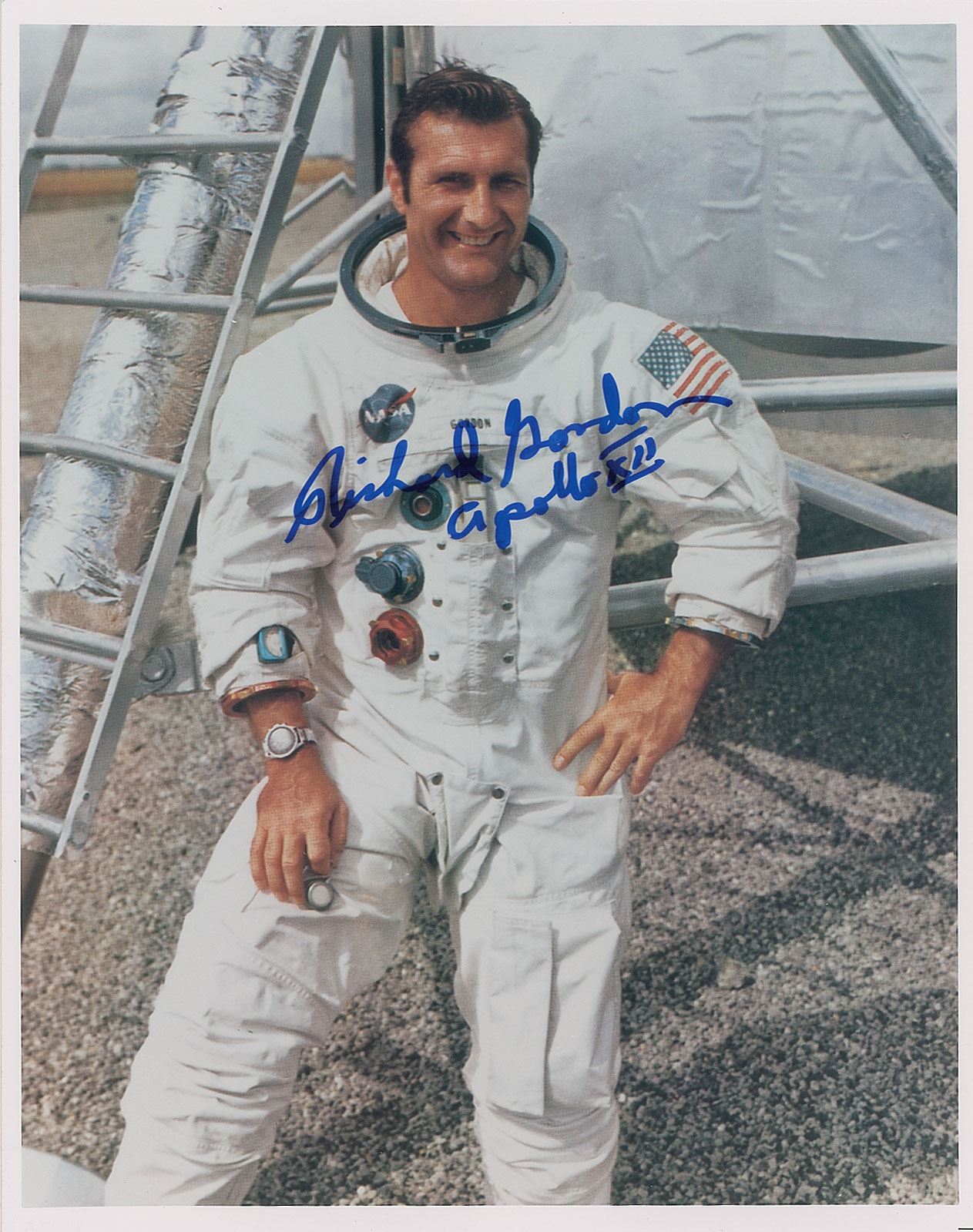 Color satin-finish 8 x 10 photo of Richard Gordon posing in his white space suit in front of the lunar module, signed in blue felt tip, "Richard Gordon, Apollo XII." In very fine condition.
