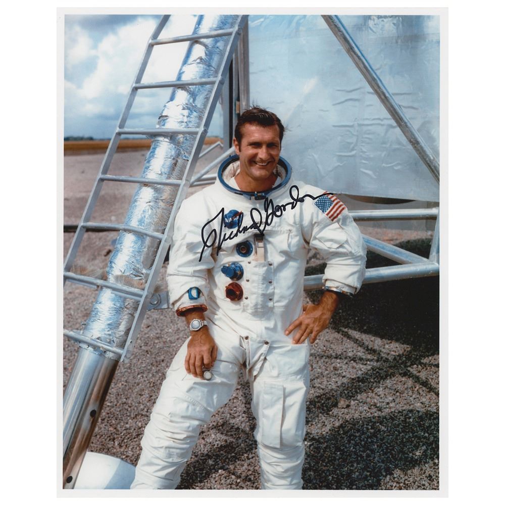 Color satin-finish 8 x 10 photo of Gordon in his white space suit at the base of a Lunar Module, signed in black felt tip. In very fine condition.