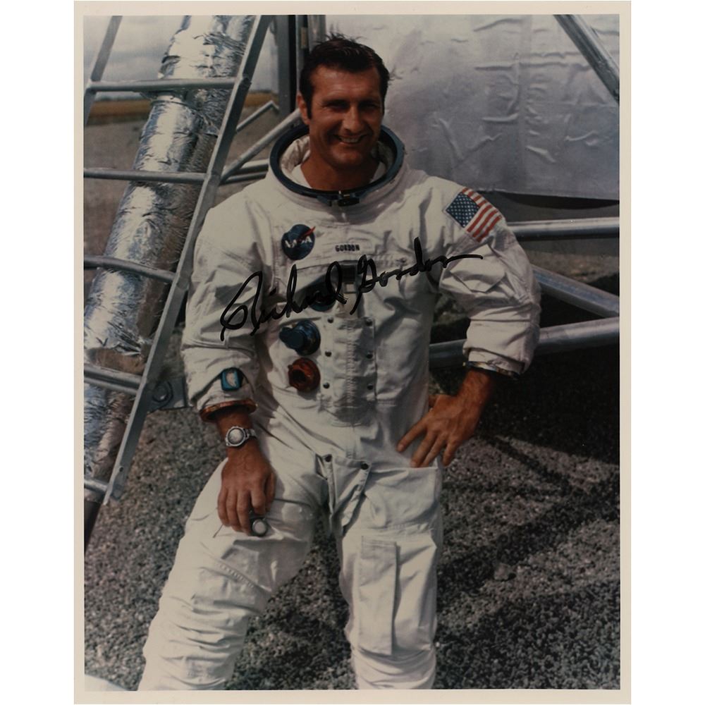 Color glossy 8 x 10 photo of Gordon posing in his white space suit, signed in black felt tip, "Richard Gordon." In very fine condition.