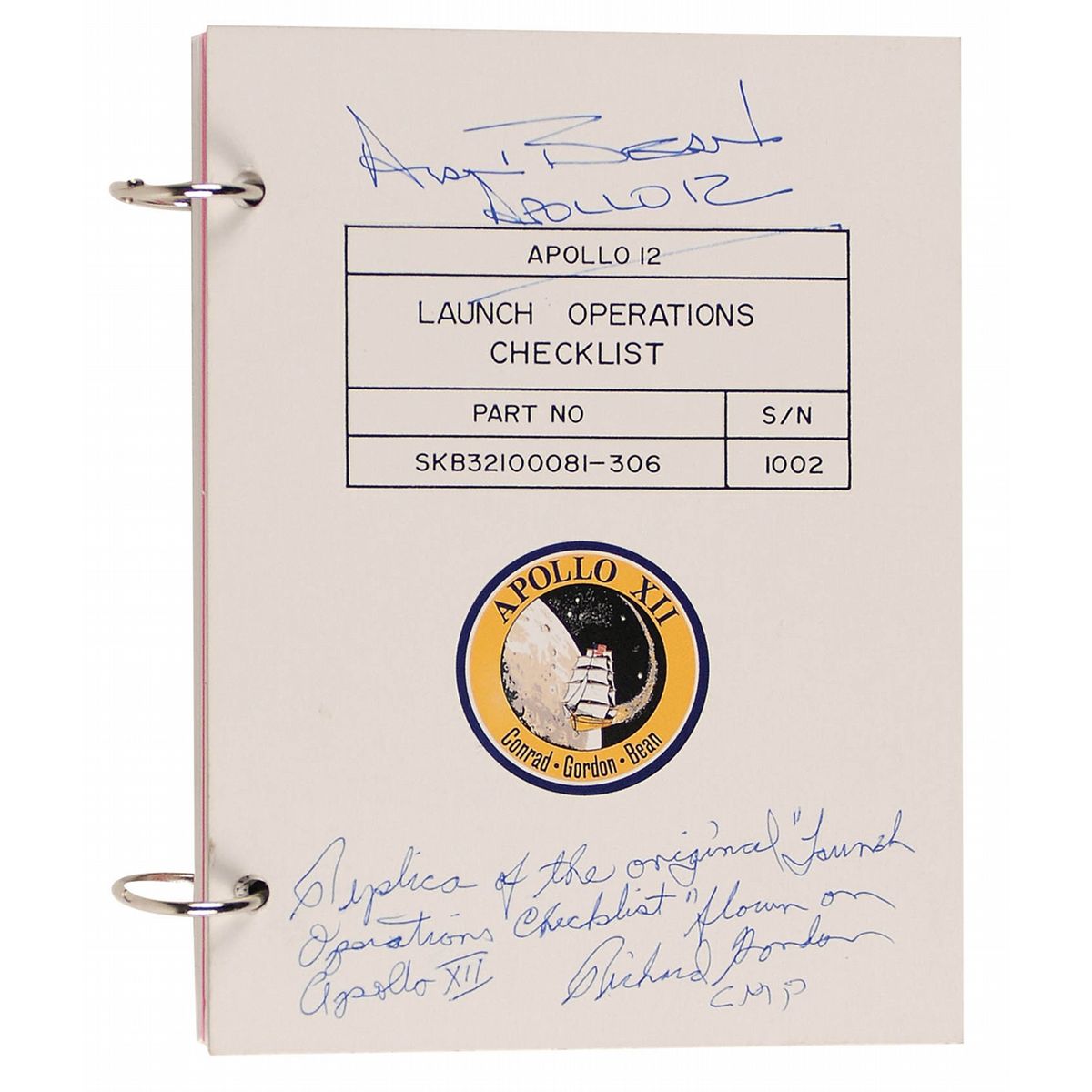 Limited edition replica Launch Operations checklist, bound by two rings in the left border, 6 x 8, with labeled tabs including “Near Insertion,” “Landing Phase,” and “Min Abort,” and signed on the front cover in blue ballpoint, “Replica of the original ‘Launch Operations Checklist’ flown on Apollo XII. Richard Gordon, CMP,” and also signed in blue felt tip, “Alan Bean Apollo 12.” Back cover also bears a label signed by the artist, Linda Gordon, Richard’s wife. In fine condition.