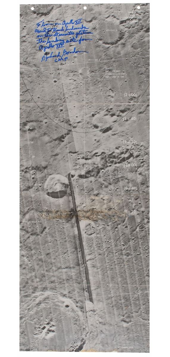 Flown map of the lunar surface carried on the Apollo 12 mission, 10.5 x 27.75, signed and flight-certified in blue felt tip, “Flown on Apollo XII, Used to track landmarks on the Descartes plateau, the landing site for Apollo XVI. Richard Gordon, CMP.” The map consists of four photographic panels taped together on the reverse and has filing holes at the top. Adhesive remnants to two panels of the map, otherwise fine condition. Accompanied by a signed letter of provenance from Gordon, in part: “These maps helped us to locate our position around the moon and to locate and track with the Command Module (CM) sextant preferred sightings. This lunar map was used during Apollo XII to facilitate tracking the Lunar landmark designated DE1 on the Descartes Plateau. It shows the ground track of Apollo XII on revolution 42. The IP (initial point) starts at crater Kant C which is 2 minutes, 19 second from DE1." Gordon piloted the Command Module during Apollo 12, remaining in lunar orbit while crewmates Charles Conrad and Alan Bean journeyed to the surface. He completed 45 orbits of the moon in the Yankee Clipper, taking important mapping photographs of proposed landing sites for future missions and conducting a lunar multispectral photography experiment. This map was used toward the end of the ten-day mission to identify areas of the Descartes Highlands, which later became the Apollo 16 landing site. A superb flown map of one of the most well-known areas of the lunar surface.