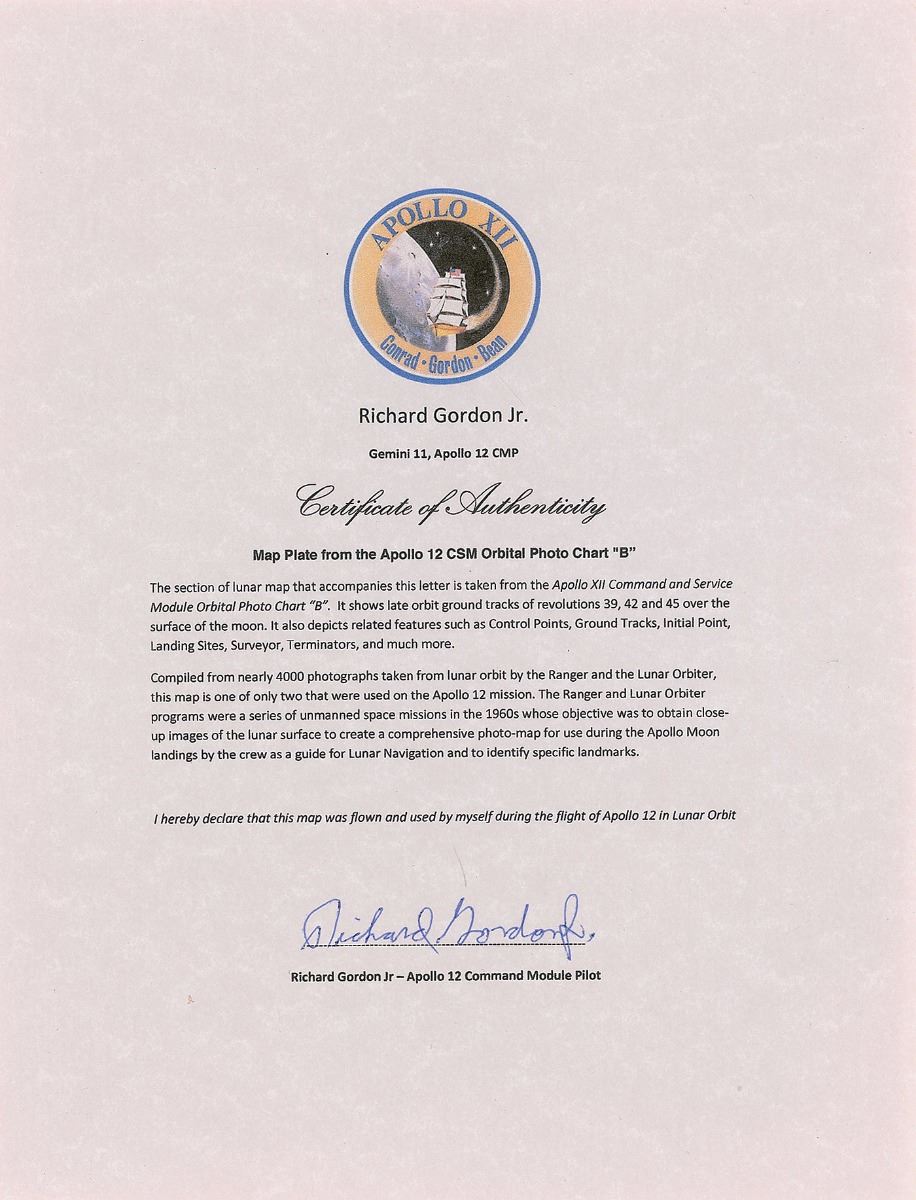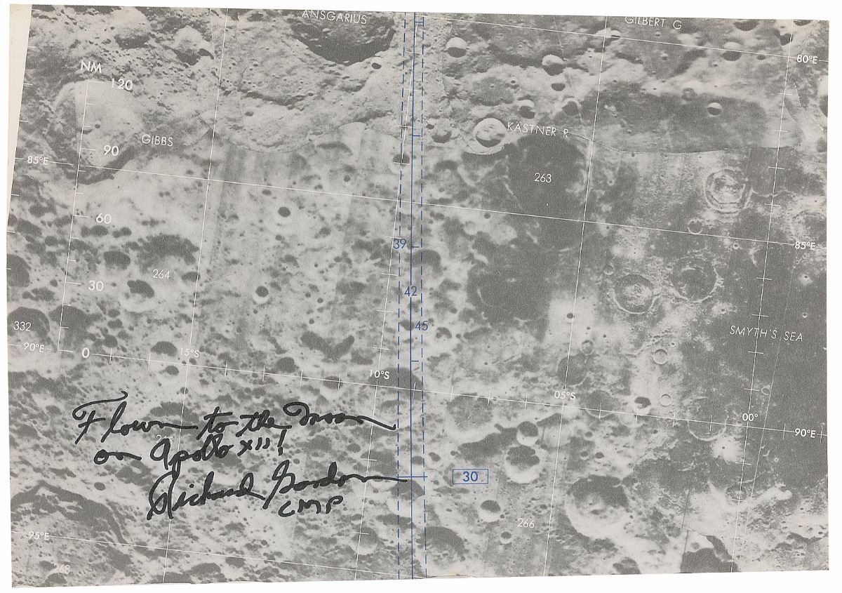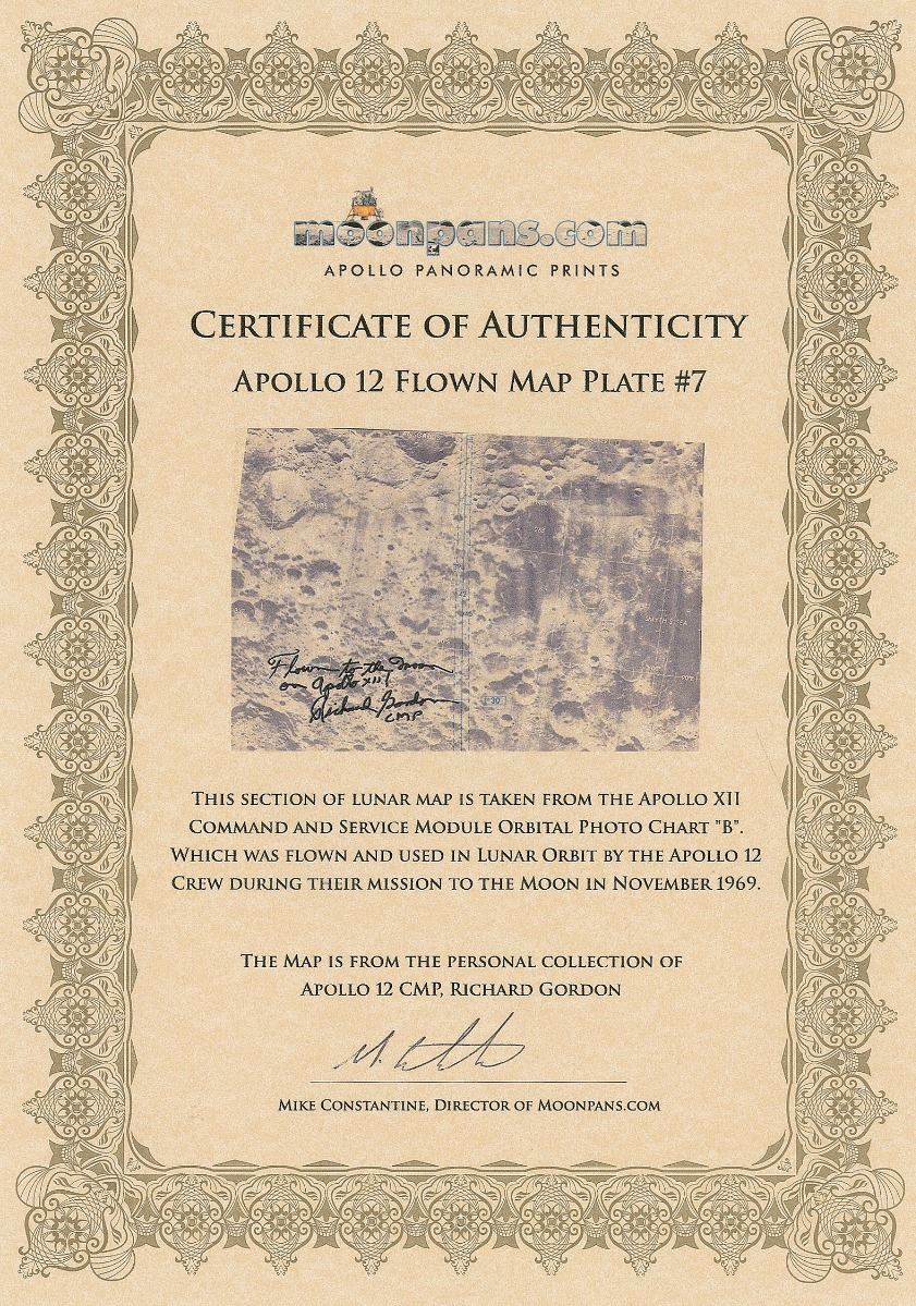 Flown map of the lunar surface carried on the Apollo 12 mission, approximately 10.5 x 7.25, derived from ‘Plate 7’ of the ‘CSM [command and service module] Orbital Photo Chart B,’ and signed and flight-certified in the lower left in black felt tip, “Flown to the moon on Apollo XII! Richard Gordon, CMP.” In fine condition, with evenly trimmed edges and some tape remnants to reverse. Accompanied by a full certificate of authenticity from Moonpans and a signed letter of provenance from Gordon. Letter of provenance reads, in part: “Compiled from nearly 4000 photographs taken from lunar orbit by the Ranger and Lunar Orbiter, this map is only one of two that were used on the Apollo 12 mission.” Utilized by command module pilot Gordon as a guide for lunar navigation and to identify specific landmarks, this lunar map details late orbit ground tracks of revolutions 39, 42, and 45 over the surface of the moon, while also depicting several other related features such as control points, landing sites, surveyor, and terminators. One of only two maps used aboard the command module Yankee Clipper, this flown lunar chart played a major role in the success of the Apollo 12 mission.