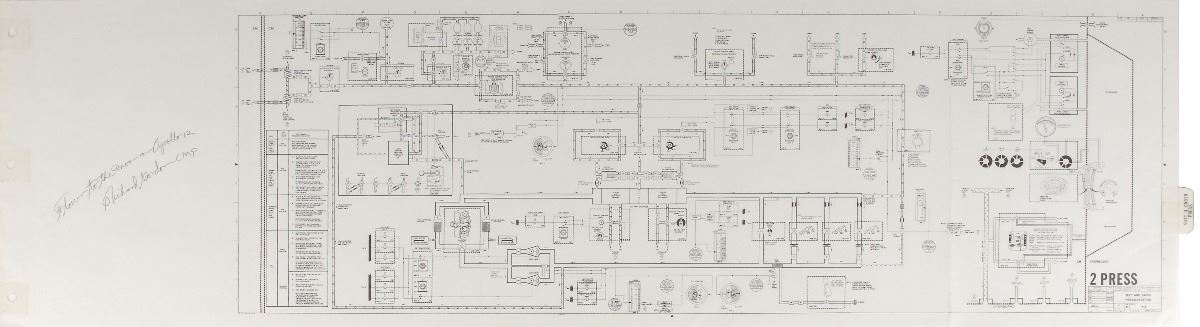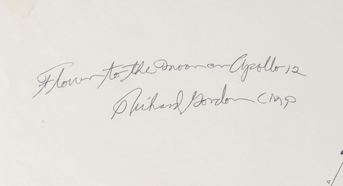 Flown Apollo 12 CSM schematic for the suit and cabin pressurization system, 36.5 x 10.5, signed and flight-certified in the blank first panel in black ballpoint, “Flown to the moon on Apollo 12, Richard Gordon CMP.” The schematic bears an affixed tab on the right edge, “Suit & Cabin Press,” and diagrams the flow through the environmental hardware of the spacecraft, consisting of many valves, control panels, tanks, gauges, and switches. In fine condition. A desirable moon-flown schematic of one of the critical systems for survival in the vacuum of space.
