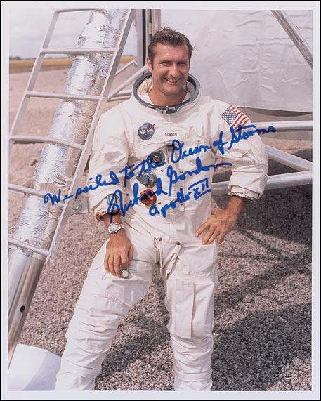 Color satin-finish 8 x 10 photo of Gordon posing in front of his lunar lander during training, signed in blue felt tip, “We sailed to the Ocean of Storms, Richard Gordon, Apollo XII.” In very fine condition.