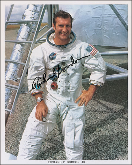 Color 8 x 10 NASA photo of Gordon posing in his space suit, signed in black felt tip “Richard Gordon.” In fine condition.