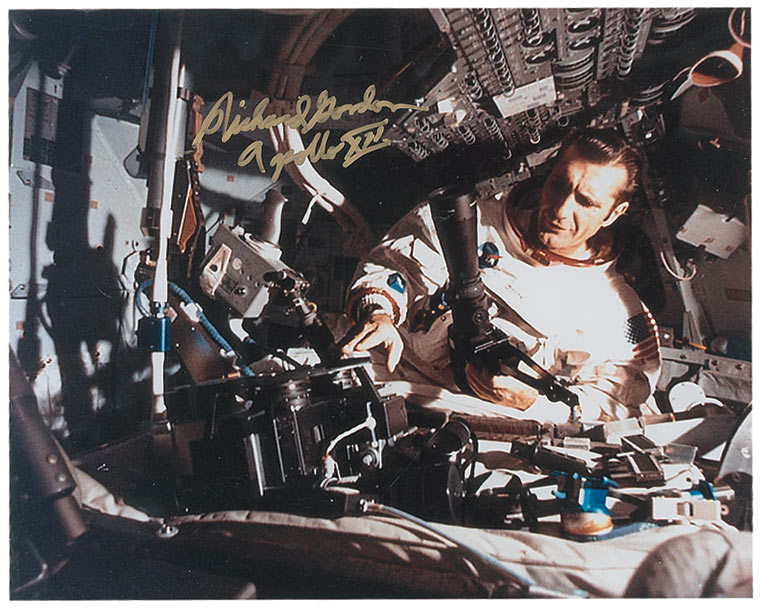Color satin-finish 10 x 8 photo of Gordon working in the cramped Apollo 12 capsule, signed in gold ink, “Richard Gordon, Apollo XII.” In very fine condition.