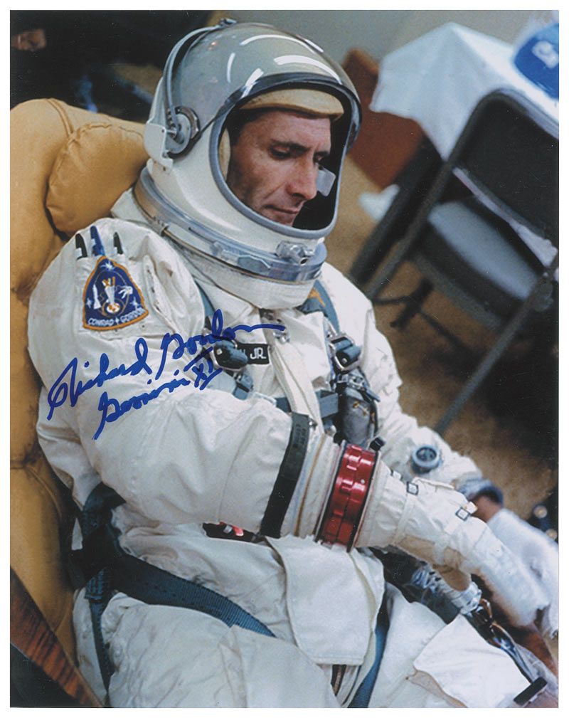 Color glossy 8 x 10 photo of Gordon preparing for his Gemini 9 flight, signed in blue felt tip, “Richard Gordon Gemini XI.” In very fine condition.