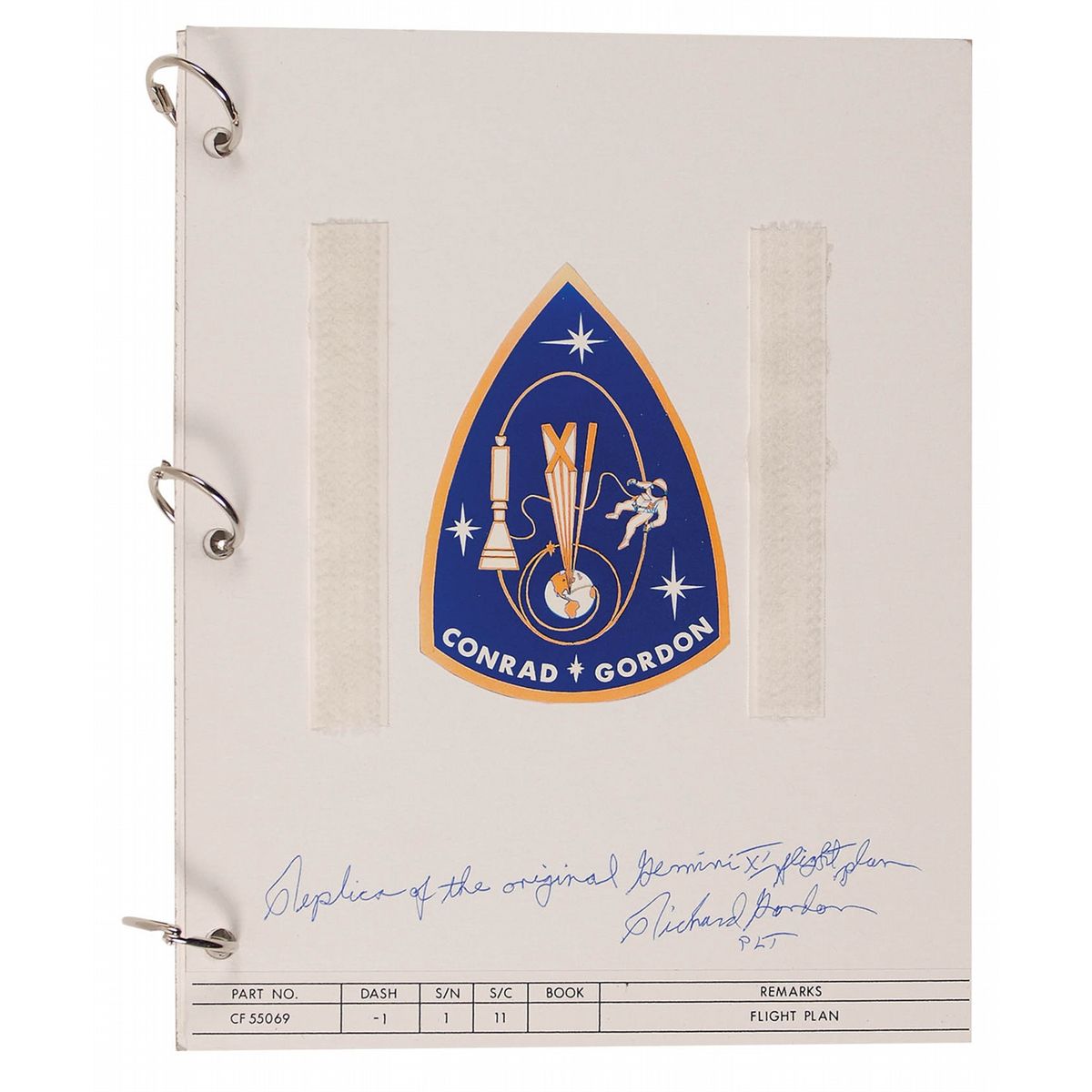 Limited edition Gemini 11 replica flight plan, #47/50. An exact replica of the actual flown Gemini 11 Flight Plan including the paper stock, graphics, binder rings and even the Velcro strips on the cover. Signed on the front cover in blue ballpoint, “Replica of the original Gemini XI flight plan, Richard Gordon PLT,” and also signed on a label affixed to the back cover by artist Linda Gordon. In fine condition.