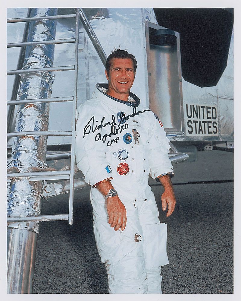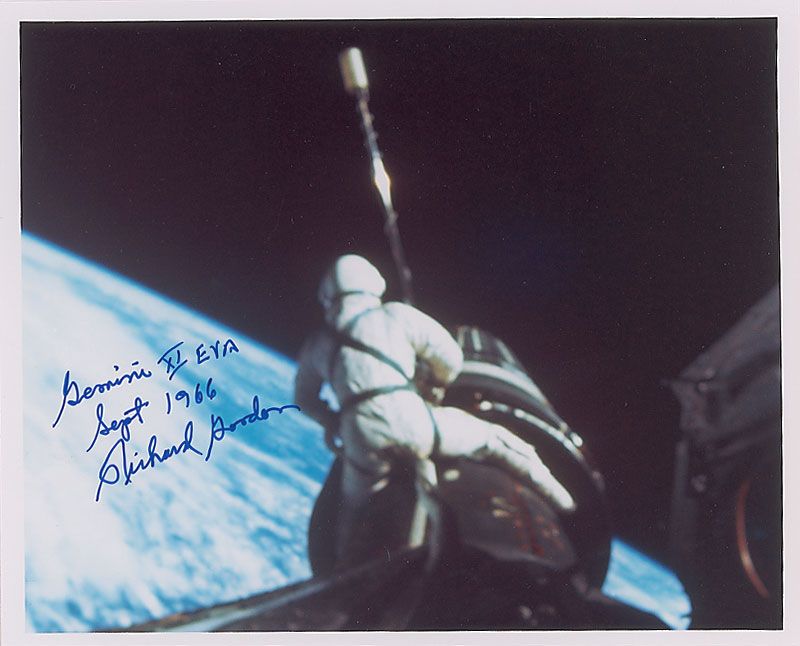 Two color satin-finish photos: a 10 x 8 of Gordon performing his Gemini spacewalk, signed in blue felt tip; and an 8 x 10 of Gordon posing in front of a lunar lander, signed in black felt tip. In very fine condition.