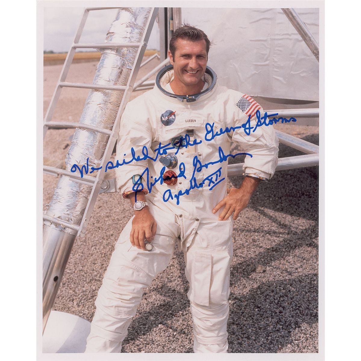 Color satin-finish 8 x 10 photo of Gordon posing in his space suit, nicely signed in blue felt tip, “We sailed the Ocean of Storms, Richard Gordon, Apollo XII.” In fine condition, with a bend to the upper left corner tip.
